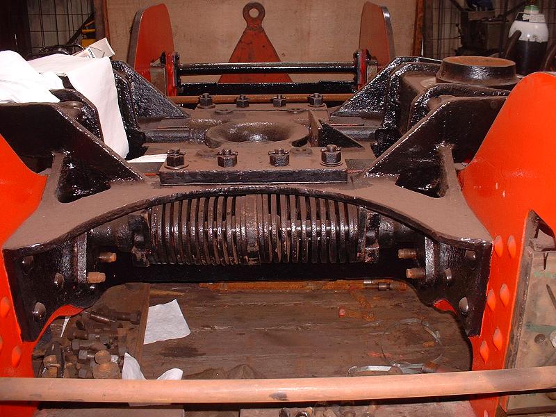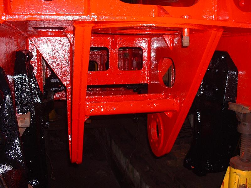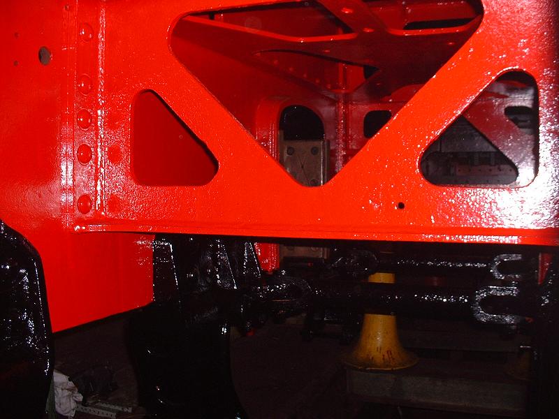 the inside of the frames, looking forward from the right-hand centre hornblock - the red paint extends from the rear of the stretcher in front of the front axle to the front of the stretcher behind the rear axle