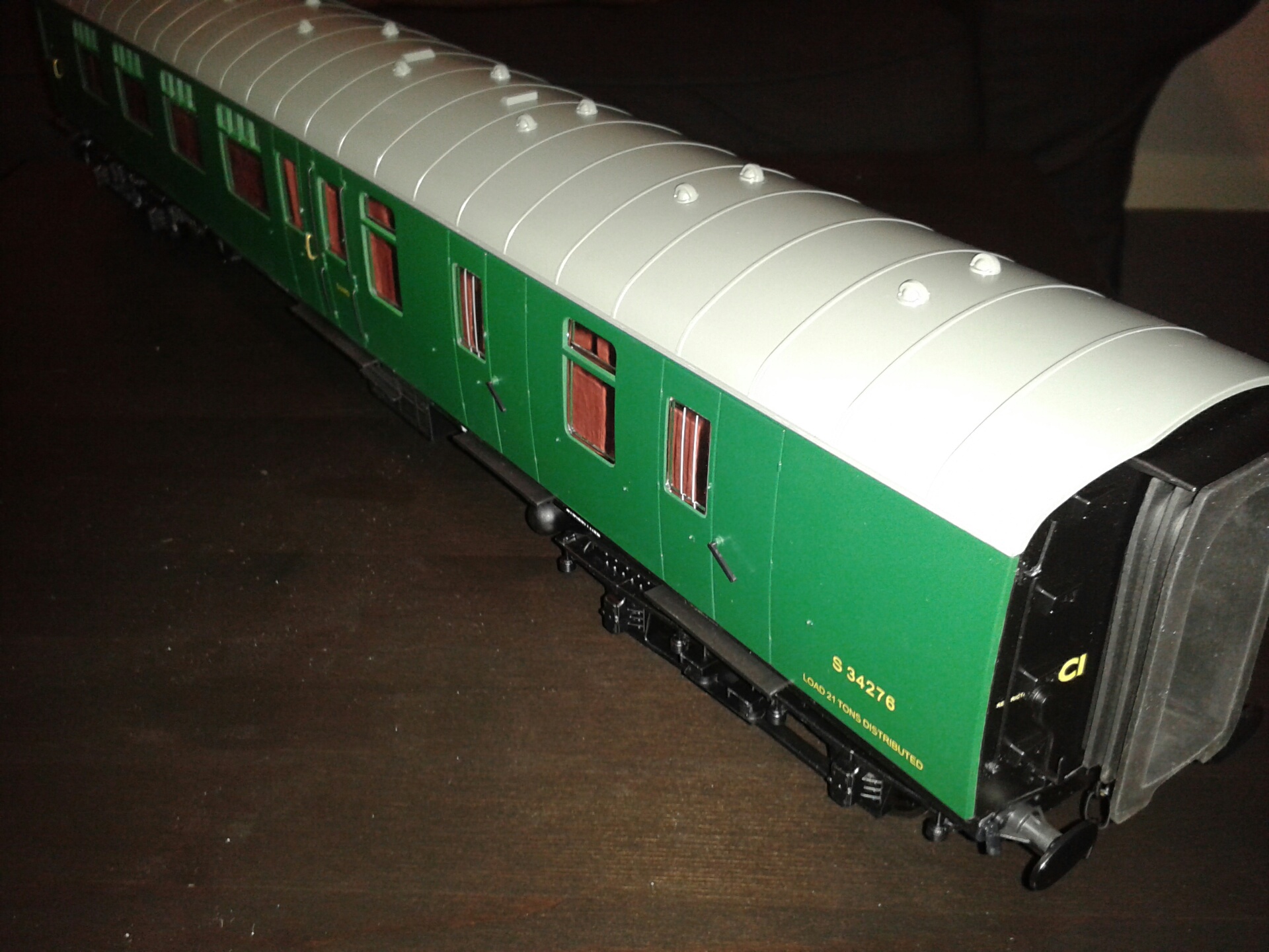 16/2/15 I ordered a set of four coaches in SR green from the G1 Model Co on Friday and they arrived today. They are nicely finished with full interior detail. The roof appears white in the camera flash but is mid grey in reality. I ran the engine on the rolling road yesterday to show my son and grandson, and I noticed that when running fast the pressure did fall away from the 4 bar mark, suggesting that the burners are not strong enough. Today I removed three strands of wick from each of the burners to leave 27, and I'll take the engine and the new coaches down to the track tomorrow (Tuesday) to see how they run.