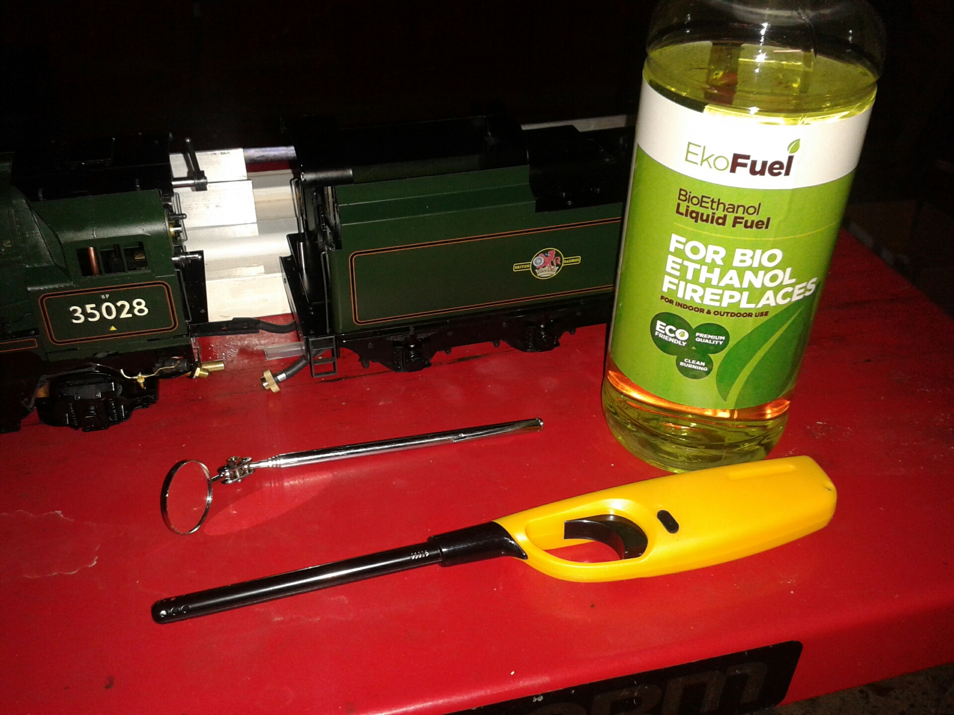 18/1/15 I ran again on the rolling road this morning, mainly to try out reverse gear which I'd forgotten to do previously, and also to try out my new purchases from eBay - 6 one-litre bottles of bio-ethanol from EkoFuel, a gas lighter and a mirror to inspect the fire, along with the 5 litres of distilled water. All worked well and the mirror was particularly useful. I coloured the fuel with green food colouring to avoid mistakes. I'm not now using the breather tube extension - I don't seem to need it as long as the engine and tender are on the level.