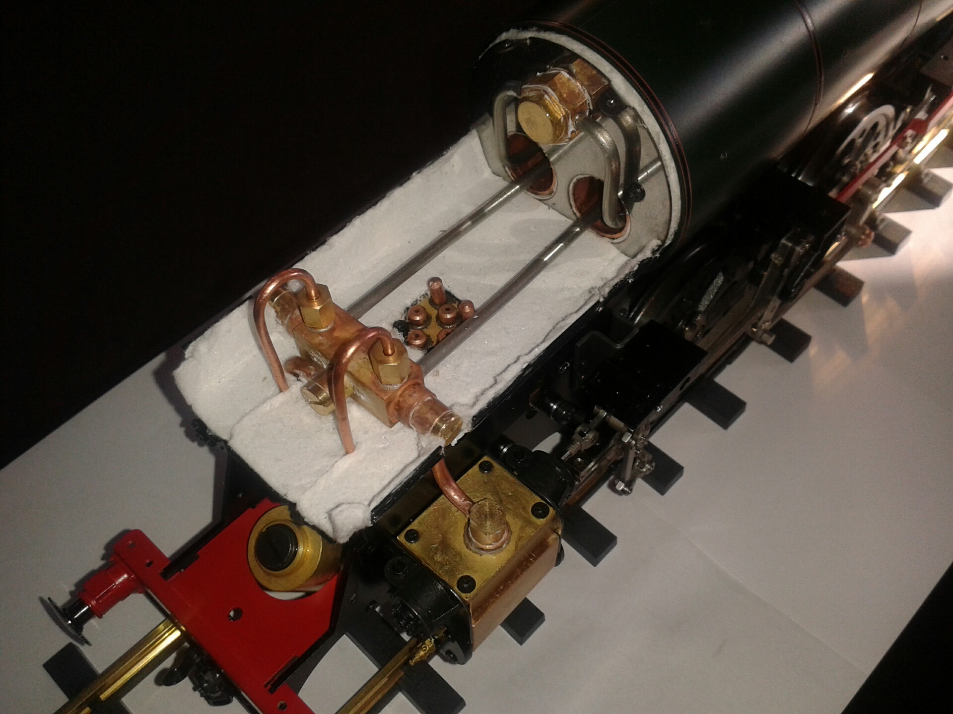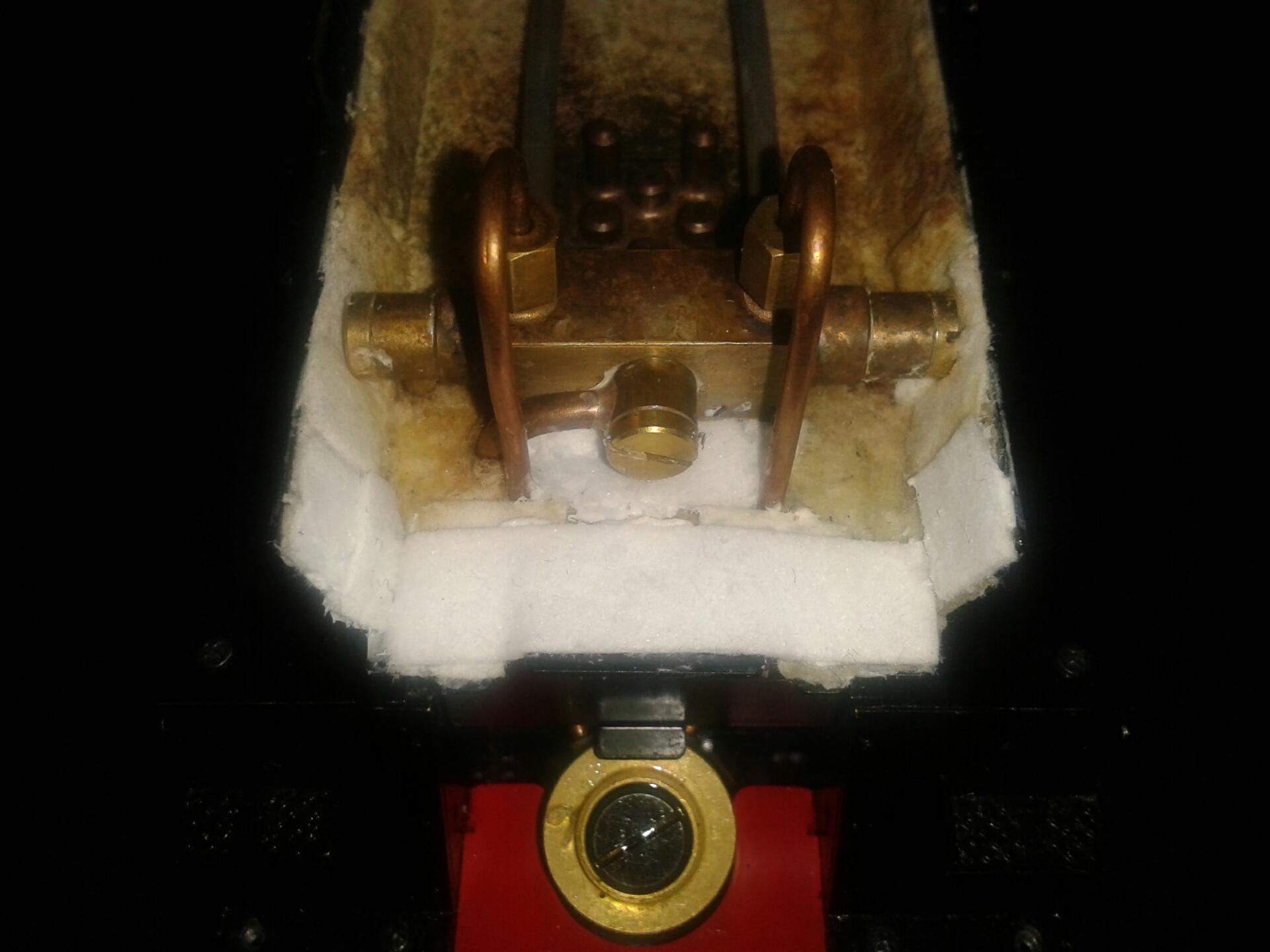 26/2/15 I've removed the smoke deflectors and smokebox and I did find some small gaps in the insulation around the steam pipes and oil pipes at the front end. In cases where there was a slit in the ceramic sheet to allow entry of the pipes, the material around the slit seems to have eroded away and left a wider gap. The photos in Step 11 above show the insulation in its pristine state - this photo shows the front end after patching over the slits with strips of insulation held down with plenty of sealant. Just to be safe I've also added a second narrow strip around the rear end of the smokebox roof insulation where it butts up to the circular plate on the front of the boiler, although I don't think there was any gap here. The fact that the insulation had eroded away suggests that there must have been quite some rush of air through the slits, so hopefully the repairs will make a difference. The original insulation is surprisingly dirty after just a few hours running - quite a lot of water is blown up through the exhaust when starting a run. I'll try on the rolling road tomorrow to see if I can detect any improvement in the burner strength.