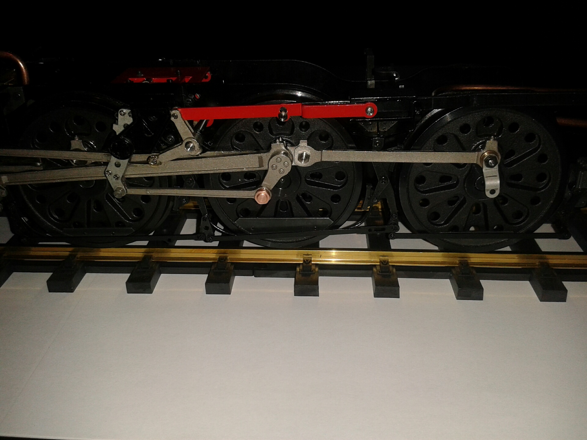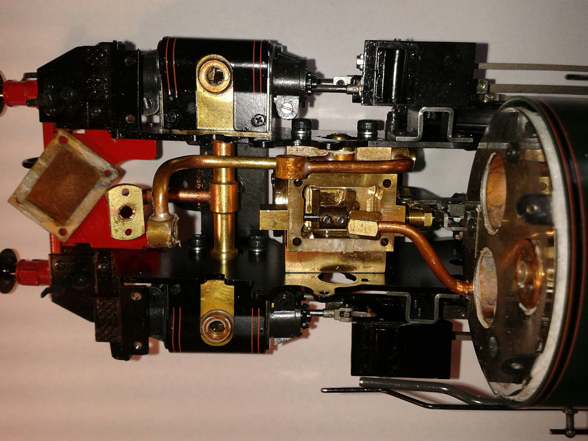 The model has three cylinders as on the prototype, with three independent sets of Walschaerts valve gear. The valves are slide valves rather than piston valves, so the valve gear is set up for outside admission with the return cranks leading the crankpins and the radius rods attaching to the combination levers below rather than above the valve crossheads. I was initially a bit disappointed because I assumed that the prototype would have inside admission piston valves like the Britannia, with the return cranks trailing the crankpins and radius rods above the crossheads, but on checking this superb drawing I see that it has outside admission piston valves and so the valve motion on the model is spot on!