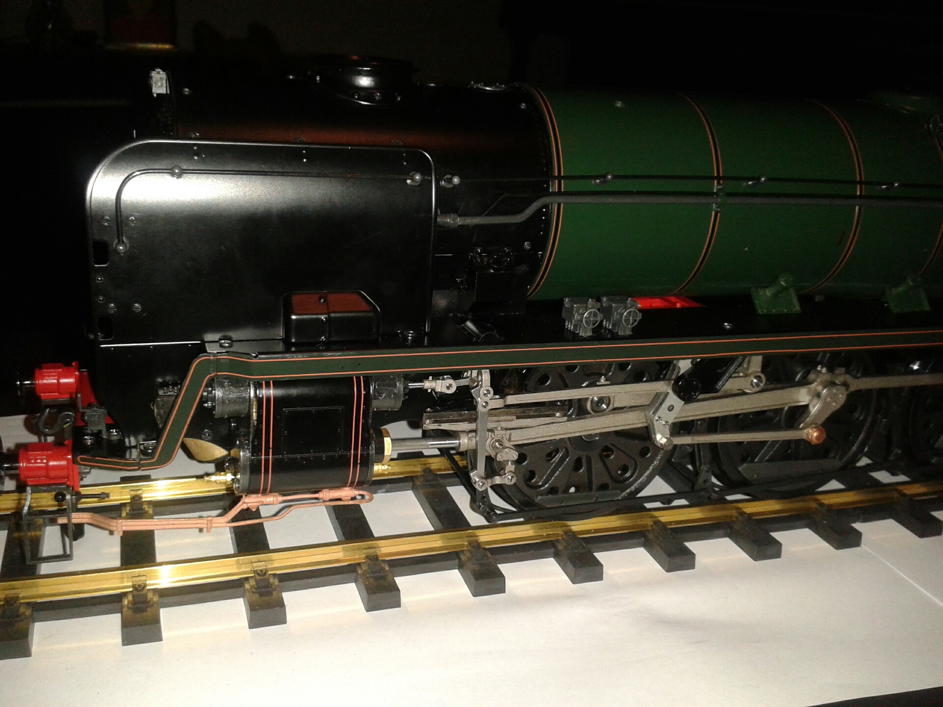 8/1/15 I made up the three hoses that connect the tender to the locomotive. I cut them so that the outer 5mm hoses hang down fairly close to the rail when the tender coupling is on the outer slot, which I assume is how it is coupled up for running. The pressurised hose taking the output from the handpump turned out to be 50mm long rather than the 70mm shown in the diagram; the other two matched the diagram. I also made up a little bracket to support the rear end of the operating rod for the front damper on the right hand side - there is a M2 threaded hole in the cab floor at the right position for this, and I suspect that a bracket here was intended to be part of the design. I also painted some of the more prominent chemically blackened castings, such as the lubricators and the fittings on top of the smokebox and tender, in satin black (Humbrol 85) to match the black paintwork. The grey finish prior to painting can be seen in the photo, although it looks much more pronounced under the camera flash than in real life.
