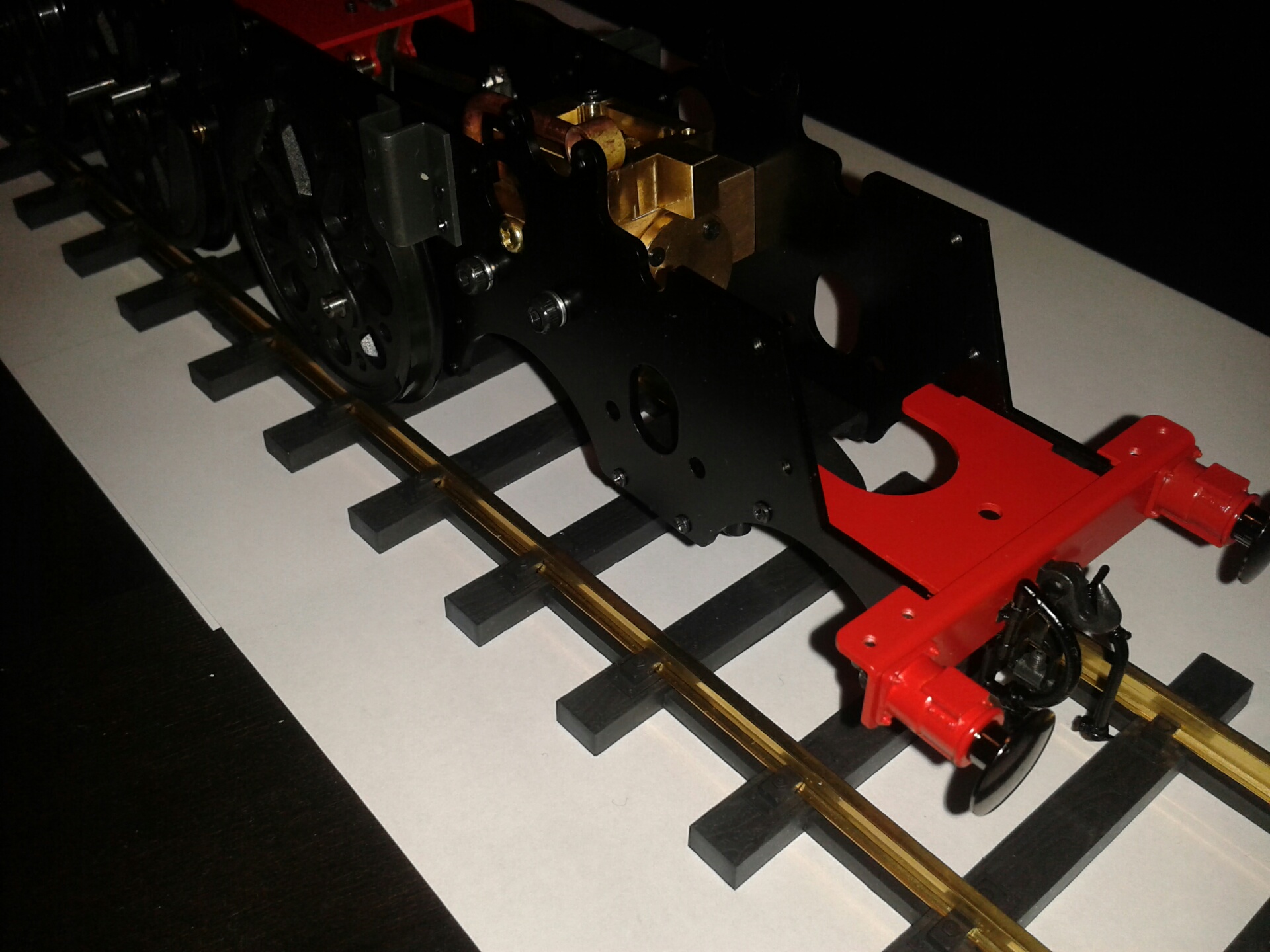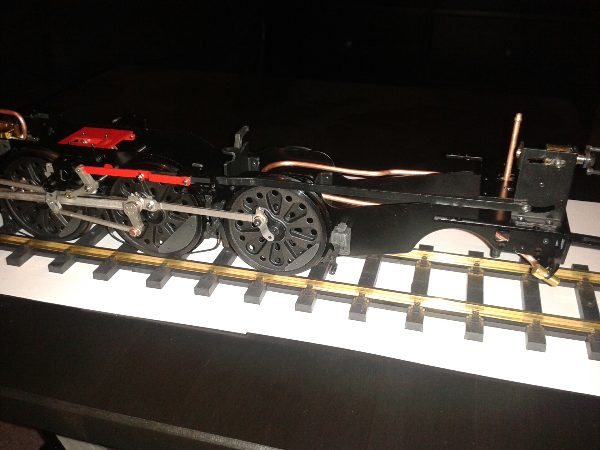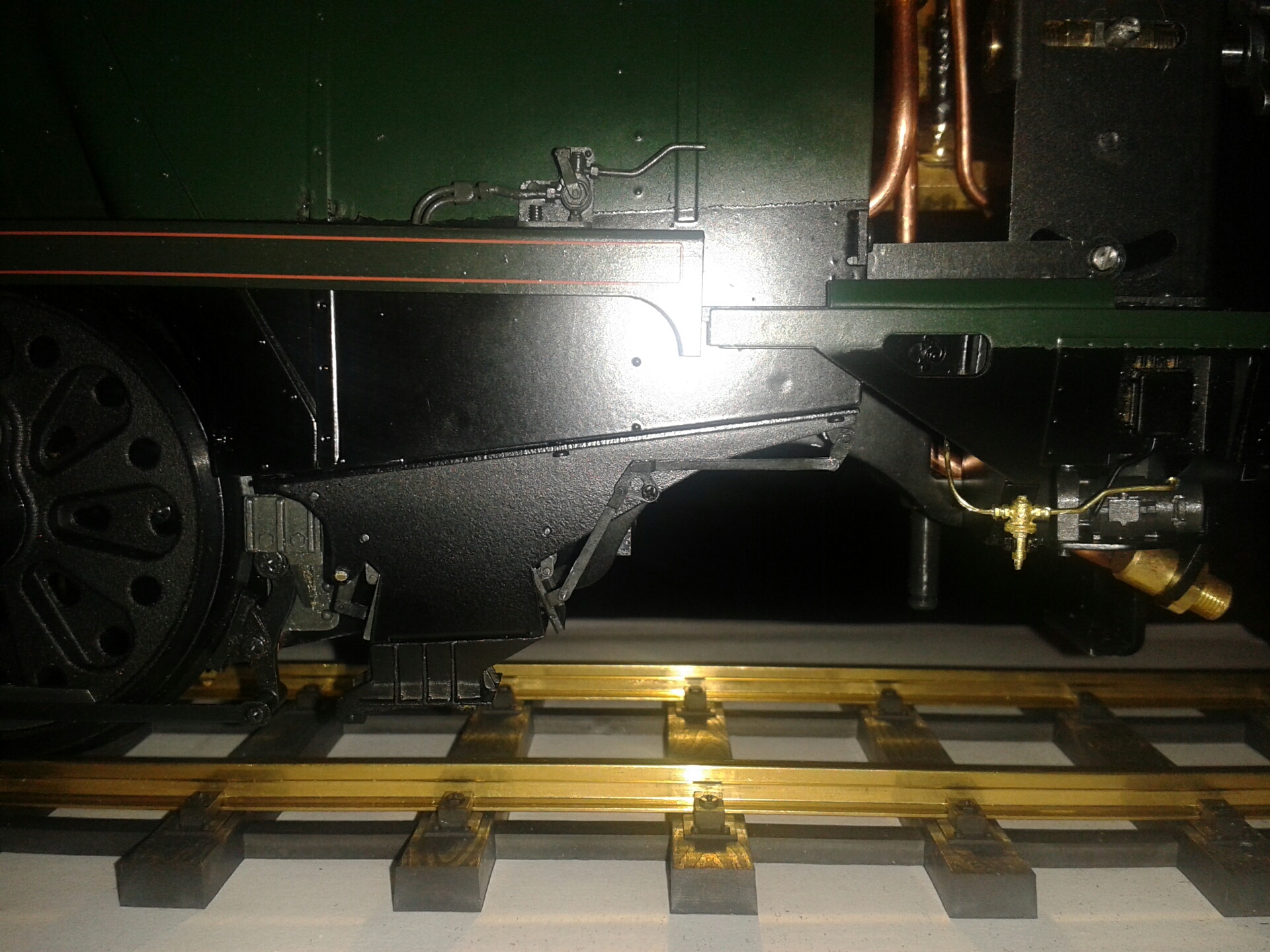 9/1/15 The extra lengths of 1mm rod arrived from Andrew today and I fitted the second smoke deflector handrail, the operating rod for the front damper and the pipes along each side of the tender frames. I cranked these at each end to fit behind the tender steps - there is a locating hole behind the front steps - and then fixed them to the tops of the spring hangers with a few dabs of superglue. I'm still waiting for the M1.7 washers from eBay to sort out the projecting screws in the cab roof before I can permanently fix the cab in place.