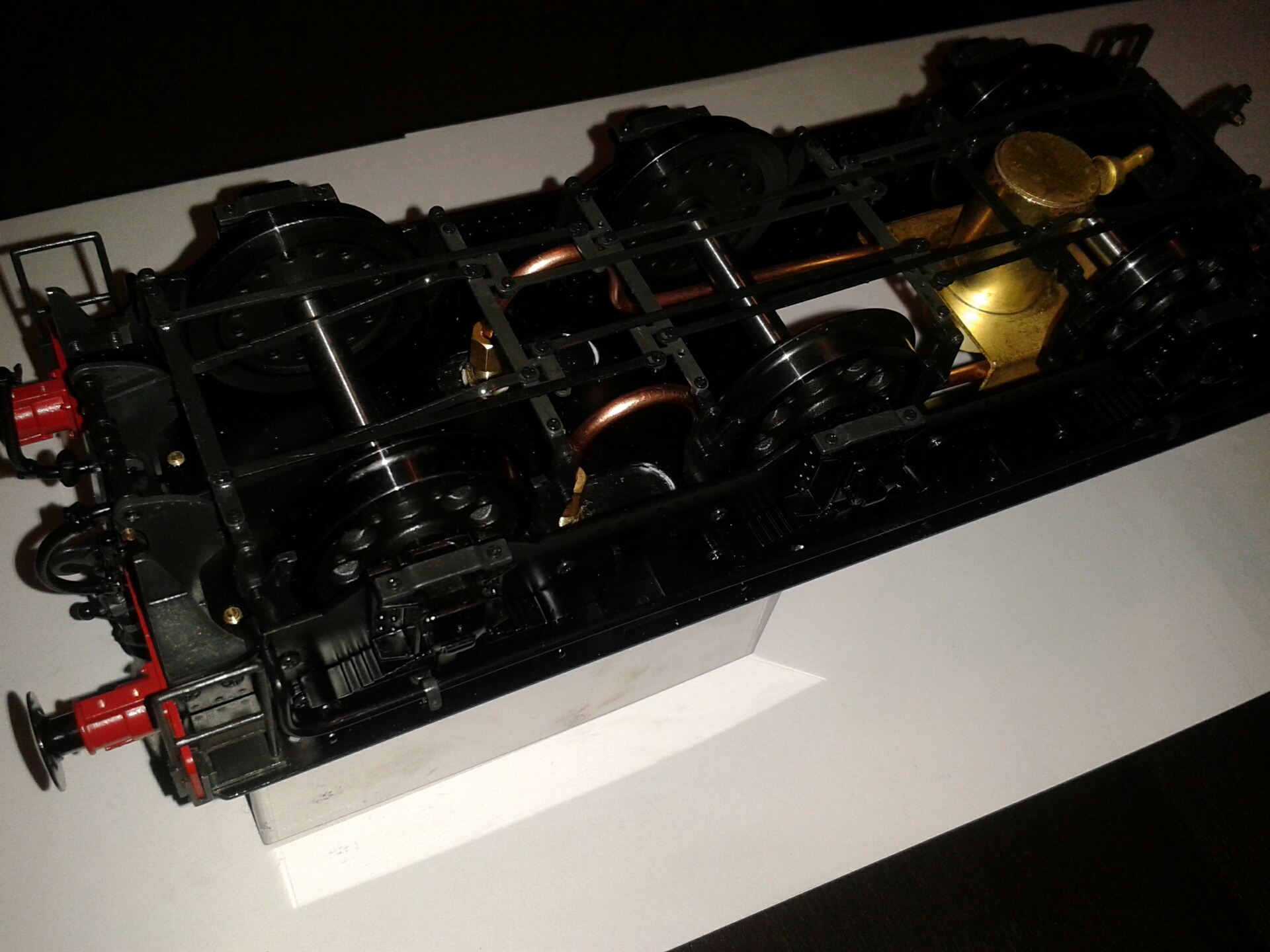 I haven't yet bought a rolling road, but since the middle axle is not sprung I decided simply to secure the chassis at both ends and let the wheels turn freely. This short video shows the model running on air, using my airbrush compressor - fortuitously the rubber hose supplied could be pushed onto the air dryer unit which is the small transparent cylinder that can be seen in the video. The air is already turned on at the start of the video, at a pressure of about 15psi, and as the reverser is wound out from midgear to full forward the engine springs to life. The reverser can then be wound back almost to the neutral position and it continues to run. It runs equally well in reverse. The valve setting is not quite spot on because when turning the wheels by hand in mid-gear one of the valves is admitting air once per revolution. Perhaps I'll take the covers off again and have a look, but I don't think it matters too much.