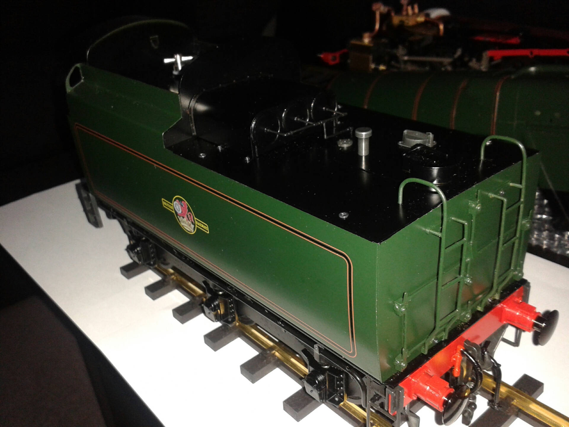 18/12/14 I've bought some 6BA brass washers and fitted two of these under the nuts on the pin securing the hand pump linkage to the pump body (see 15/12 above), and this stops the pump handle from flopping from side to side. I then fitted the tender top with its vacuum cylinders and pipes, and the lighting pipes and ladders on the rear of the tender. I used tiny dabs of Araldite applied with a toothpick on the inside of the vacuum cylinders to fix the pipework, and the same for the top joints of the handrails on the front of the tender - I left the bottom joints unglued in case I ever need to remove the tender body from the baseplate again. The delicate pipework casting on the rear of the tender does not sit quite flat because the holes are slightly too far apart, so I've ordered a set of clockmaker's broaches to elongate the holes. I suspect that the broaches will also come in handy for the loco bodywork, from what I've seen on the forum. Apart from this and a few dabs of paint on the screws that I've replaced, this completes the tender, and very nice it looks too.