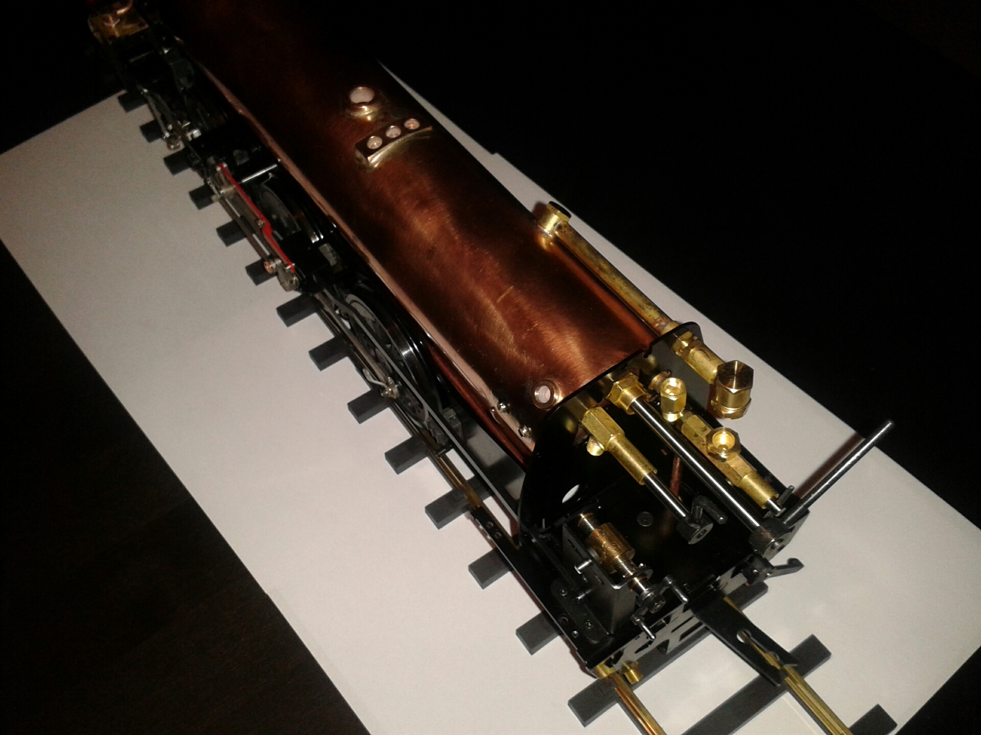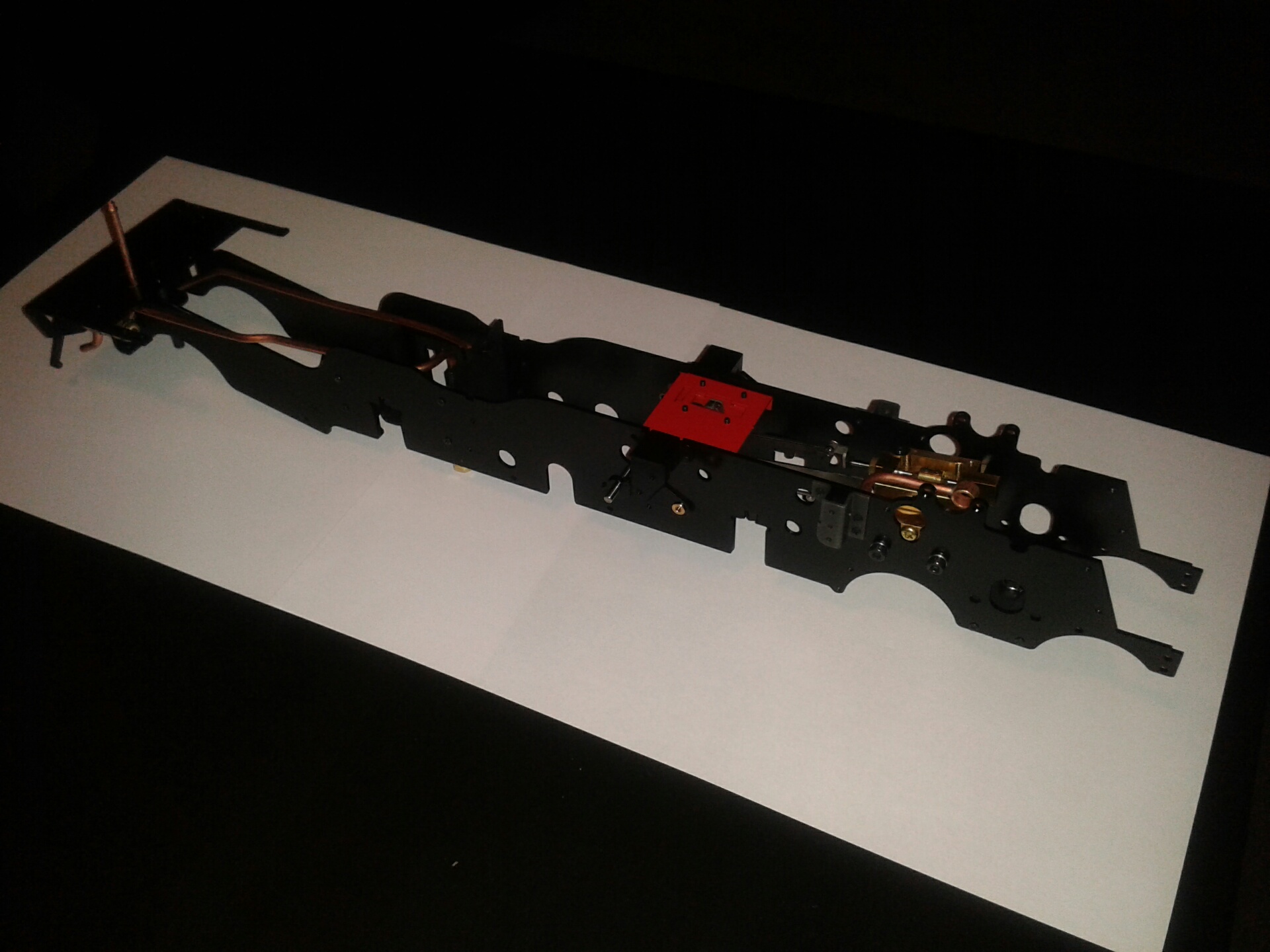 When fitting the boiler to the frames the firebox casing has to fit around the water pipes, but I found that this went together quite easily - the trick is to completely unscrew the rear stretcher and the water bypass bracket, and fit just the top centre screw out of the five holding the backhead to the casing. The nut on the vertical water pipe can be taped up out of the way near the top of the pipe. The bottom sections of the firebox casing can then be sprung apart slightly to fit over the water pipes, with the cab floor hooked over the vertical water pipe and tipped downwards at 45 degrees at the front to stay clear of the casing as it is eased down. The photo shows the result, and I must say that the level of detail on the boiler casing is absolutely exquisite, with all the panel joints and rivets picked out and all the washout plugs and mudhole doors represented.