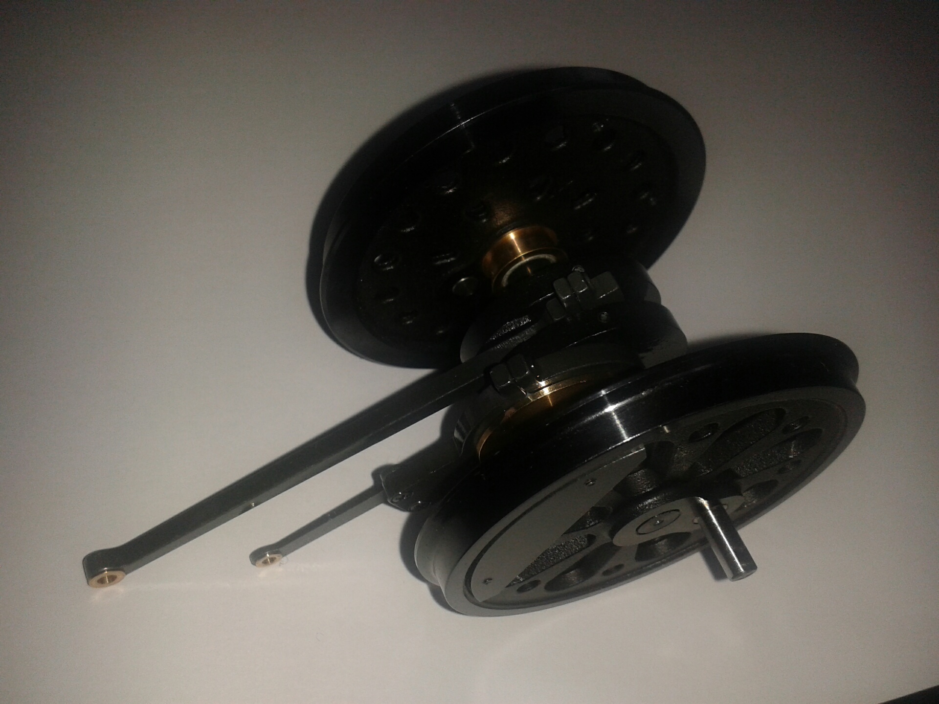 This photo shows the middle axle assembled with its balance weights and the connecting rod and valve eccentric rod. The cranks have PTFE bearings - a split cylinder that springs over the crankpin, and a strip of PTFE to wrap around the large eccentric for the valve rod.
