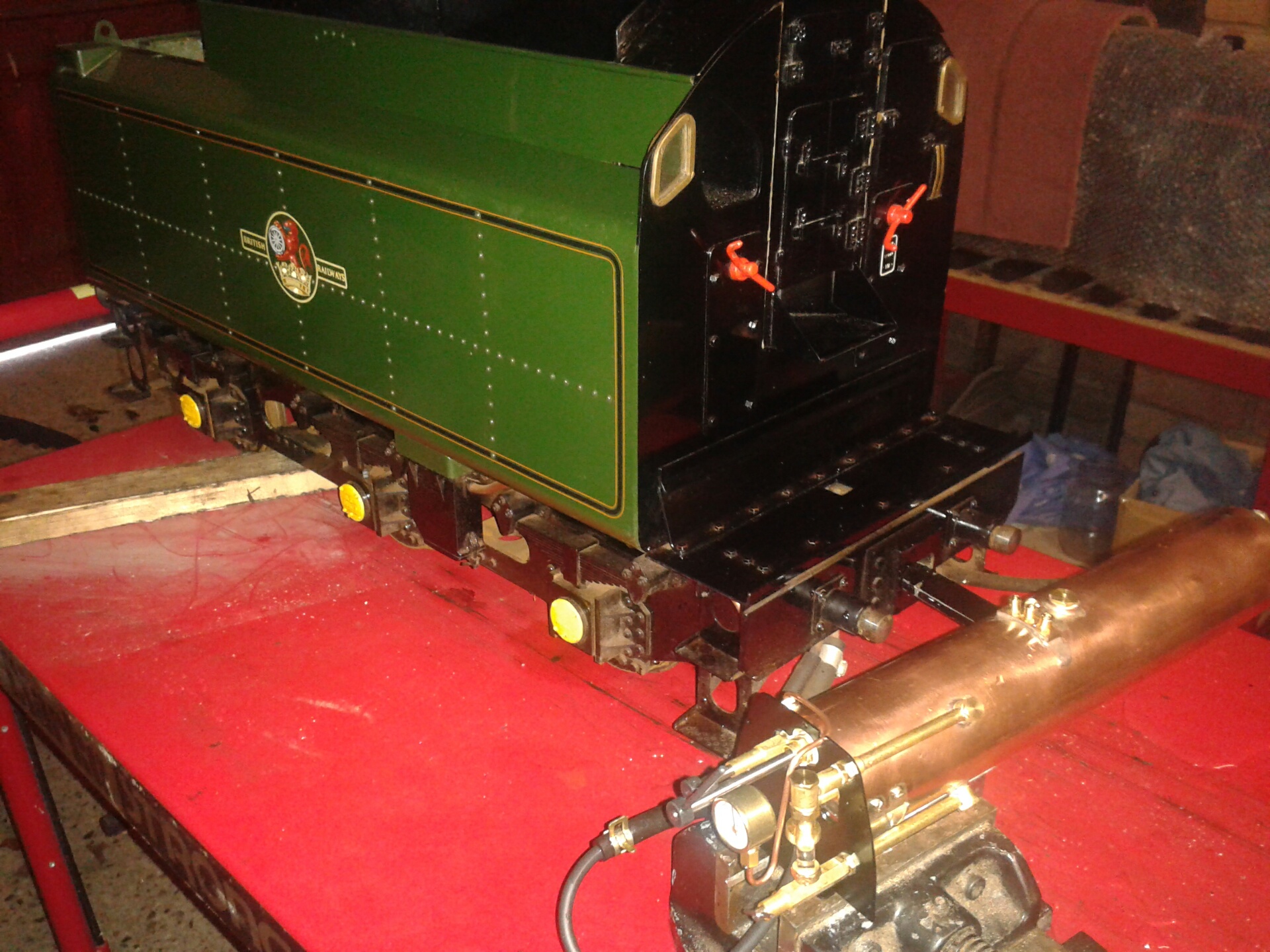 12/12/14 I connected up the boiler to my 5" Britannia tender as shown in the photograph and pumped water into the boiler until it was full, then closed the regulator and pumped the pressure up. One of the safety valves released at just over 2 bar, then holding this one down the second opened at 3 bar, and the last one opened at 4 bar. The boiler held the 2 bar pressure unchanged for several hours, which I thought was really excellent - the regulator and blower valves and the clack valve must fit perfectly. Then after checking with Andrew at Aster I made up a tool to fit the two small slots in the top of the safety valves and tightened them down slightly to get them all releasing at just under 4 bar. It only took about 1/8th of a turn. I'll do the final adjustment when I first steam, because I know from experience with the Britannia that they can behave slightly differently with steam as opposed to water (perhaps because of the temperature difference?)