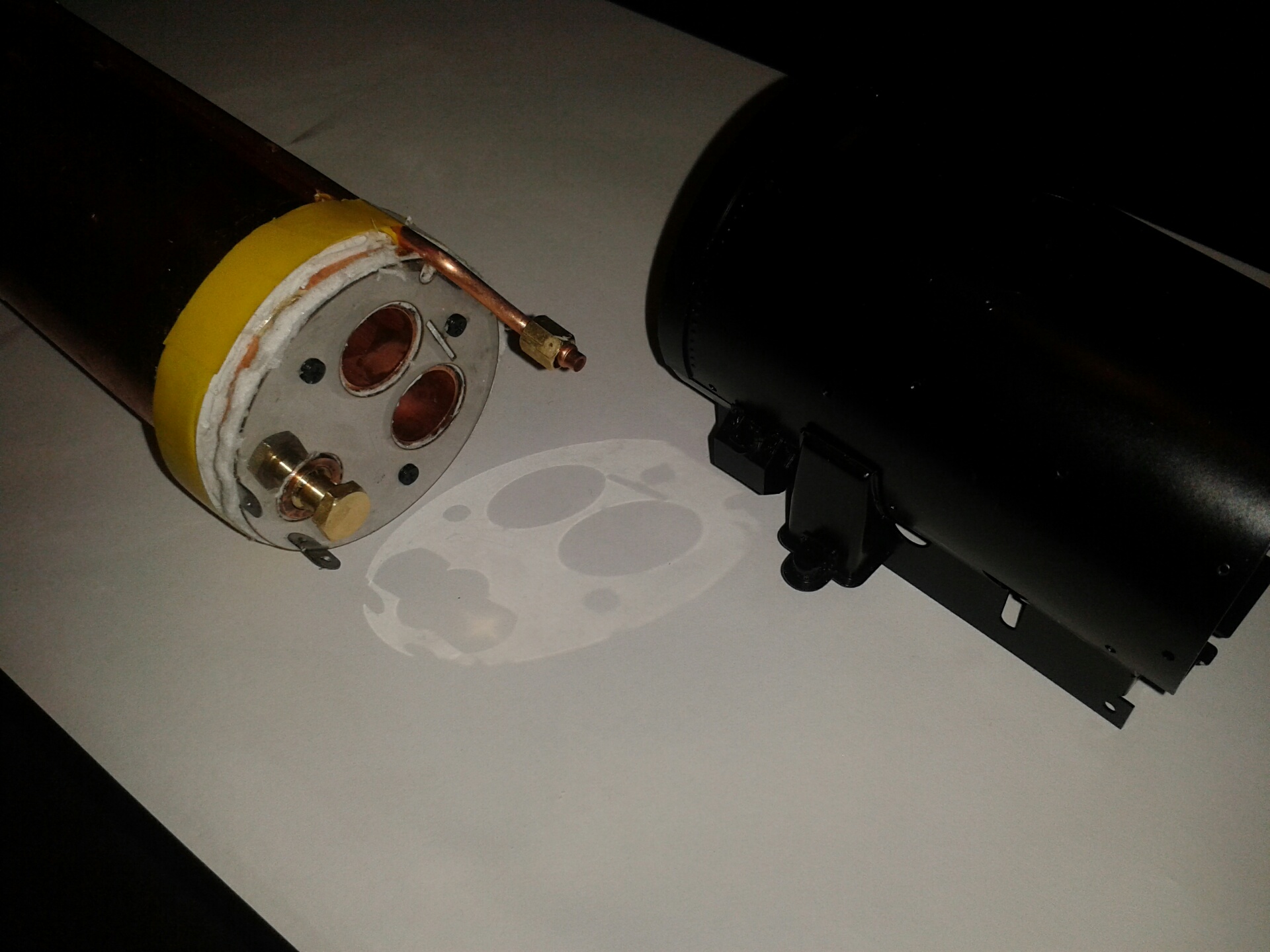 11/12/14 Today I lined the firebox with ceramic sheet, which seems to adhere nicely with the white compound, and I fixed the firebox and all the backhead fittings including the water gauge glass and pressure gauge. Tomorrow I'll fit the dome plug and safety valves and try to pump the boiler up to working pressure, using either the airbrush compressor or the tender handpump in my 5" gauge Britannia.