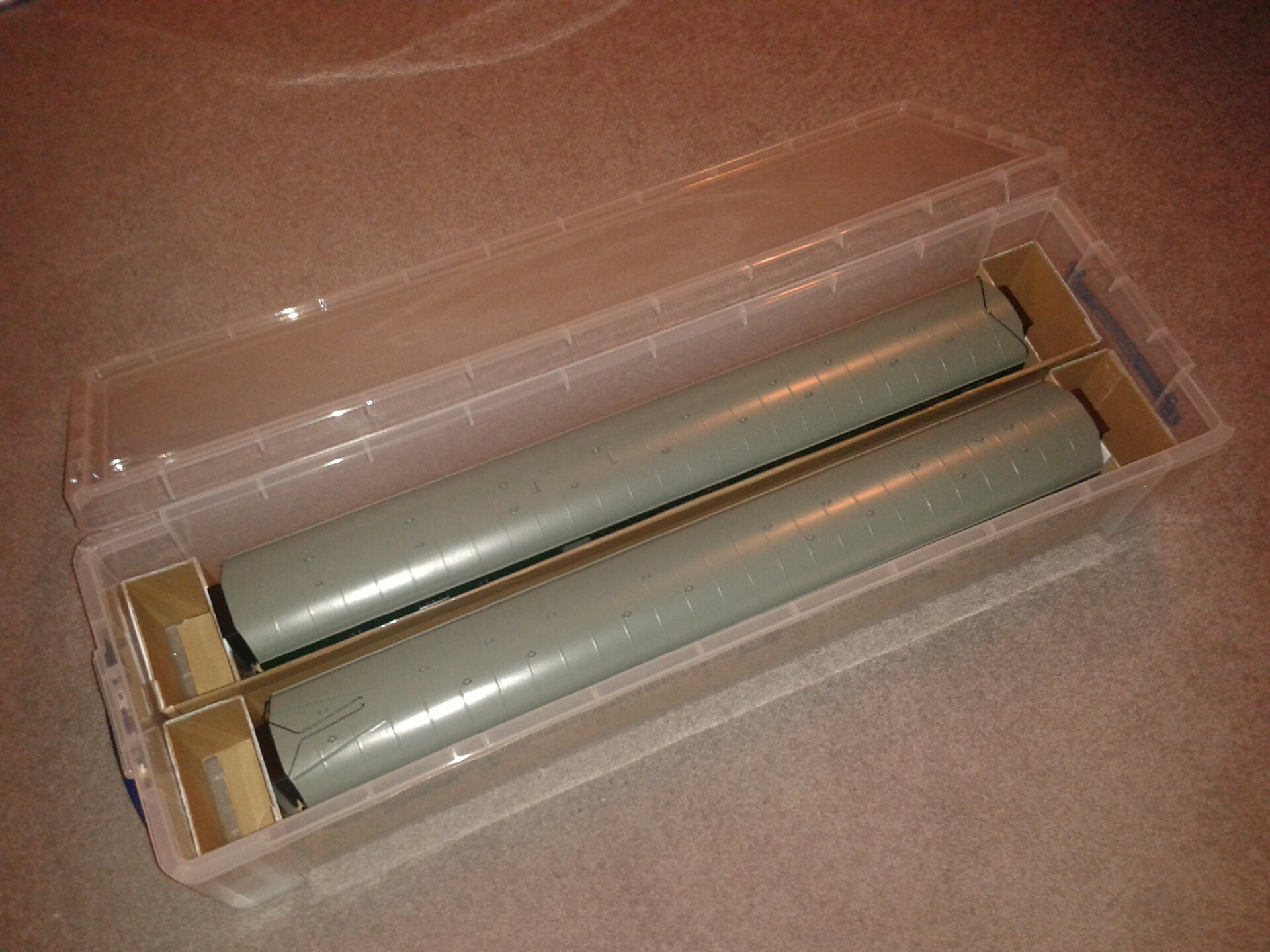 5/3/15 I ordered two more coaches from G1 Model Co today to add to my rake of four. I also ordered another of these storage boxes, on offer at £10, which are just the right size to hold two coaches side by side.