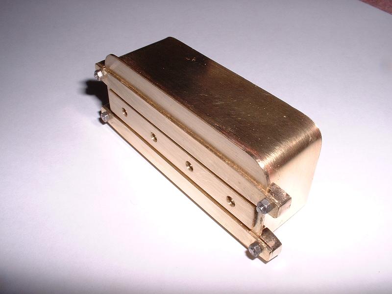 I've fabricated the AWS battery box which sits on the right-hand running board in front of the firebox, as shown here. The main body of the box is 60mm long, 27mm high and 20mm deep, which I think is about right. I used a strip of 1" x 1/8" brass for the back with a bracket along the lower edge tapped to take the screws through the running board, then bent the shell around the top and sides and soldered it, then soldered the front face on and finally fixed the front decorations with Loctite to avoid disturbing the soldered joints.