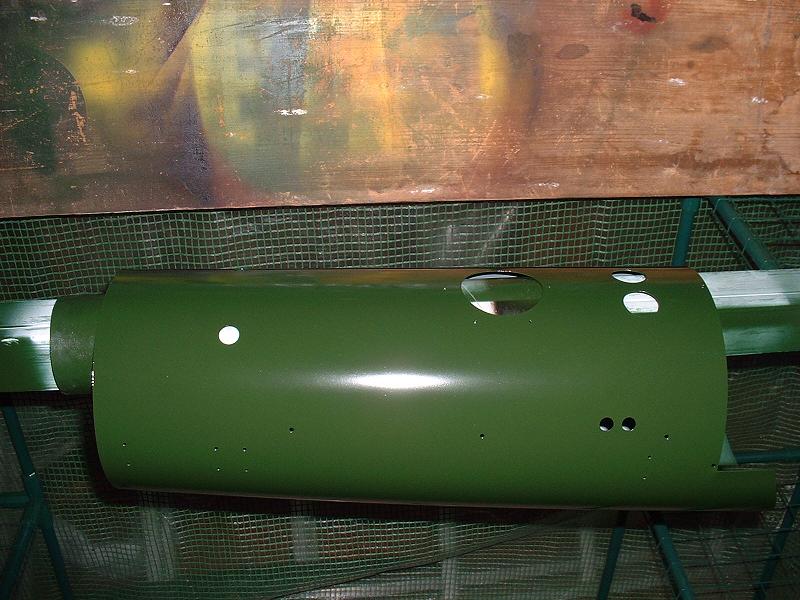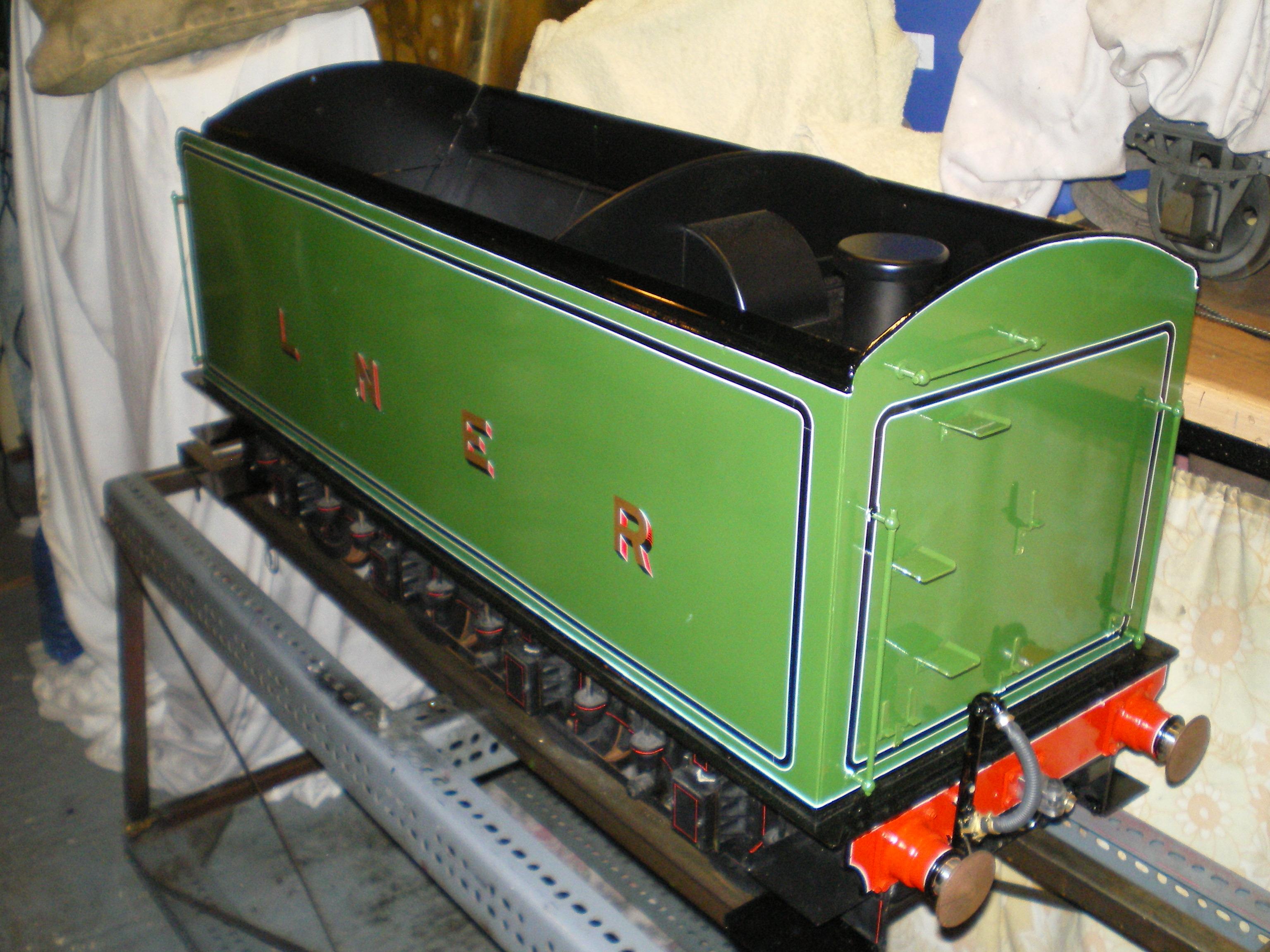 30/7/10 I've now finished all the green painting on the loco. I had to buy a third tin of P101 Loco Green from Phoenix recently (I'm probably using a lot more paint than a more experienced spraygun user would) and I was disappointed to find that it gives a slightly lighter shade than the previous tins - not really noticeable unless you study it closely, but I've had to respray one or two earlier pieces to avoid obvious boundaries, such as between the running boards and the front platework. There's not much more that I can do about it now, because I'm not going to dismantle all the cladding to respray it, and if I sent the tin back to Phoenix I'd probably get the same colour from the current batch. I suppose the moral is to buy more paint than you think you might need in a single batch, or perhaps as Rod did get the paint from a supplier (Marcel Guest in Manchester, in his case) who will mix it to order in the required quantity. I now need to order the transfers for the cab sides and also line out the running boards before reassembling these parts to complete the loco, and then I need to give a final coat of paint to the tender body and apply the transfers to it. The end is in sight!