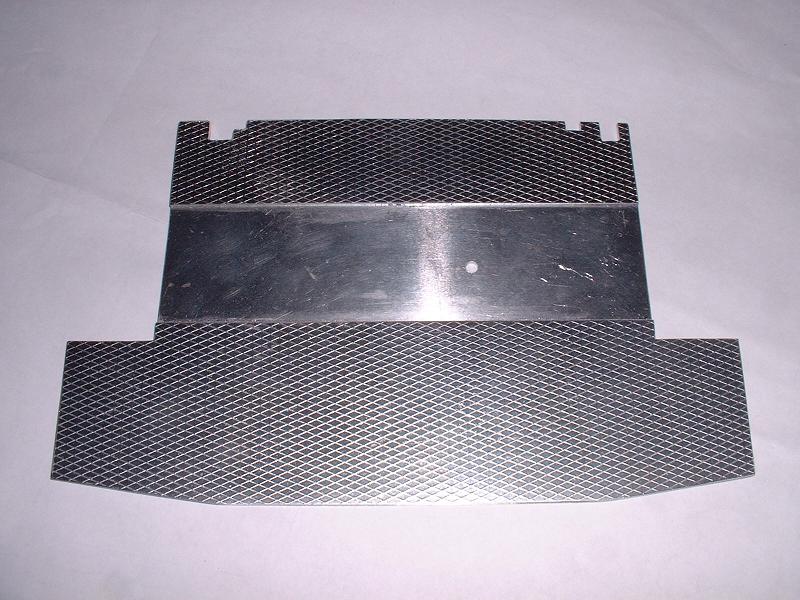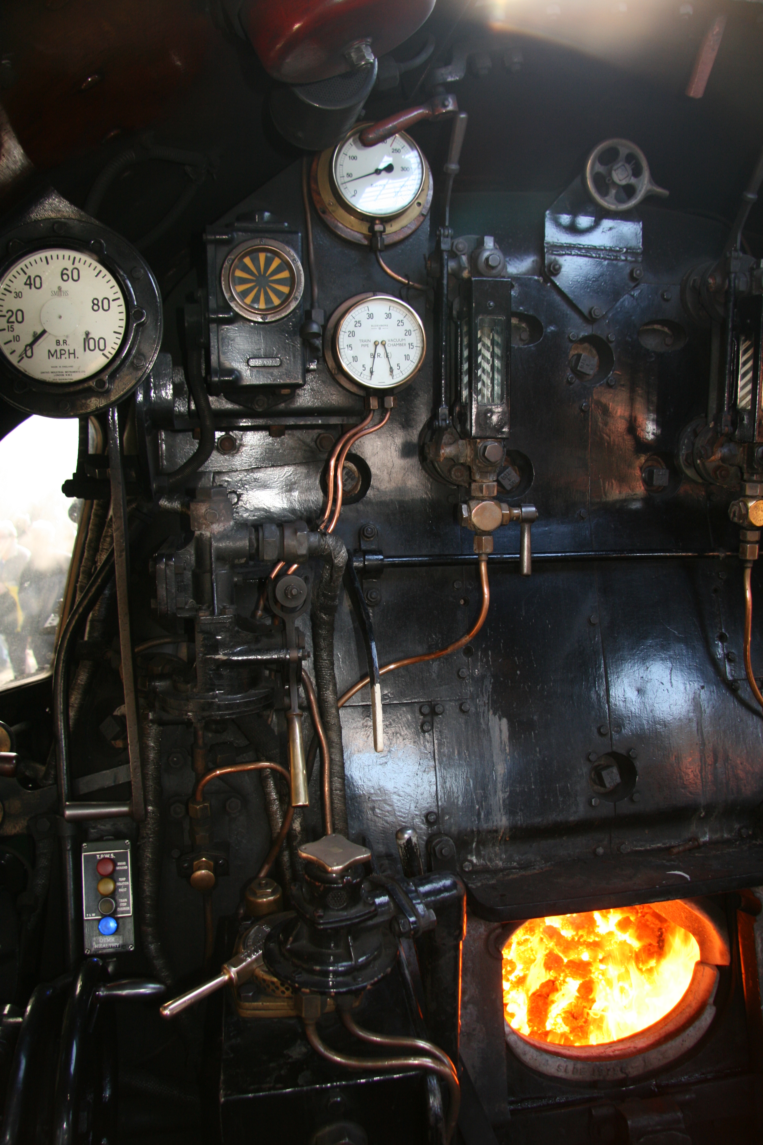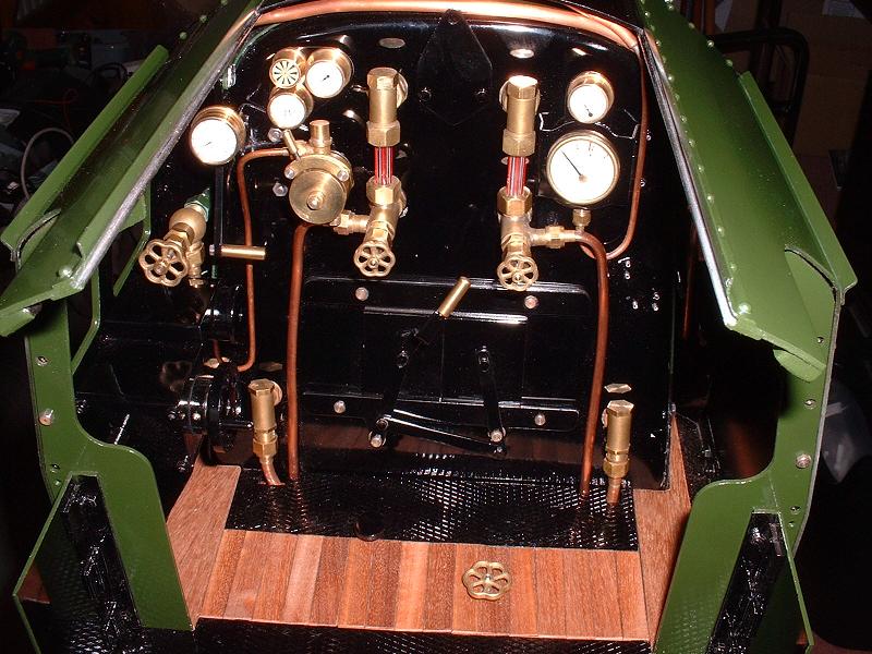 floor covering in two drop-in pieces - one behind the bulkhead and one in front. Each piece will be cut from 16g aluminium sheet faced with a combination of chequerplate and wood veneer - the chequerplate being immediately below the firebox cladding and also across the area behind the bulkhead. This picture gives an idea of the layout - the area between the seats is planked, and the pieces in front of the fireman's seat appear to be sheets of plywood. The floor covering will serve to hide the various superfluous holes in the floor resulting from my repositioning of the injector water valves and pump bypass, and will cover the gap of about 7mm between the front of the floor and the firebox cladding.