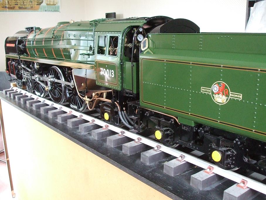 23/9/09 I've painted and refitted the drain cocks and lubricators, and refitted the front bogie which I painted literally years ago. Jon M has raised the question of the sandbox lids on the running boards - are there 2 or 3 on each side, and are they raised above the level of the boards? I'd rather overlooked these, but on consulting my copy of 'Locomotives in detail - Riddles Class 6/7 Standard Pacifics' (ISBN 0-7110-3177-0), available from Amazon, it seems that Britannias 70000 - 70029 had 2 on each side and the later ones had 3, and all the locos originally had lids flush with the running boards but some were later fitted with raised lids. Fortunately both 70013 and Jon's 70007 remained with flush lids throughout their lives, so we don't need to splash out on Doug's castings!