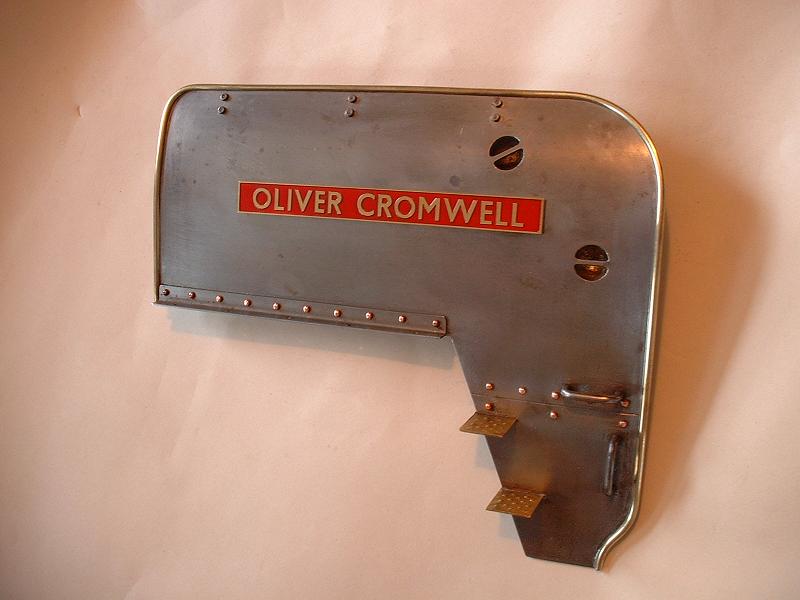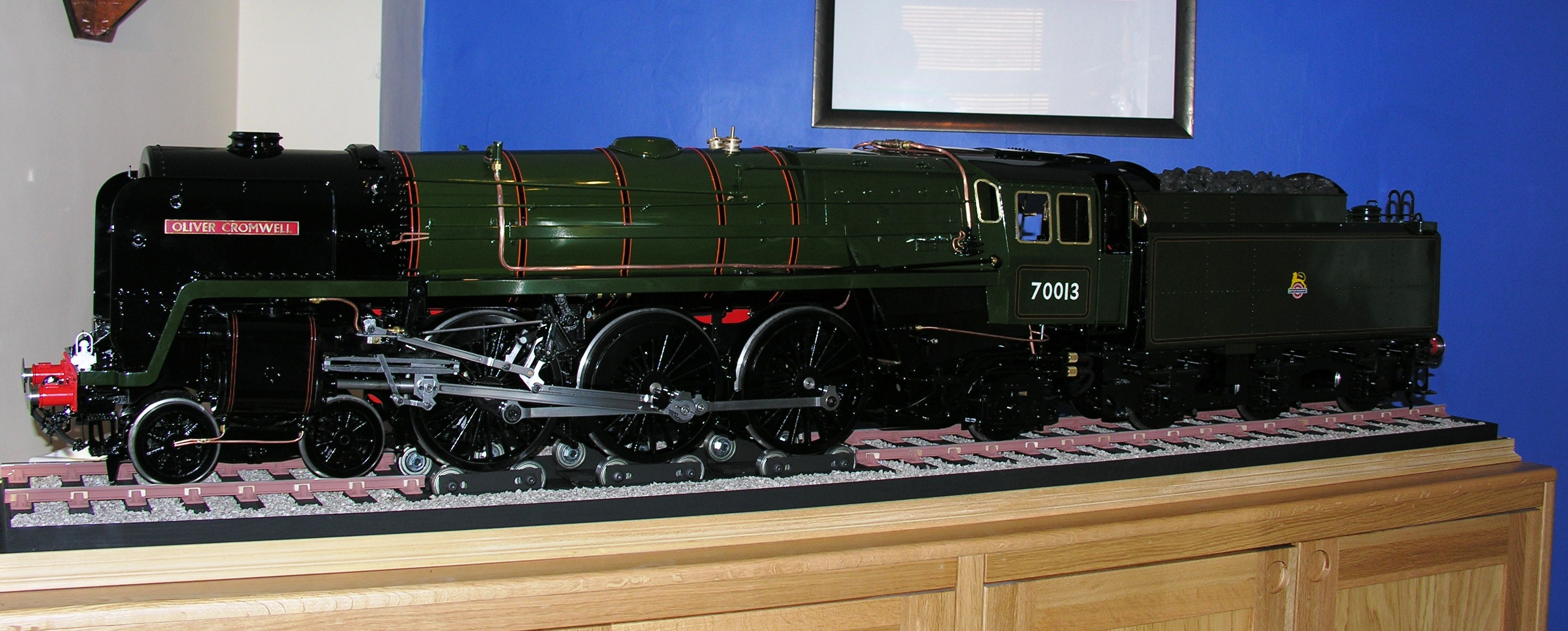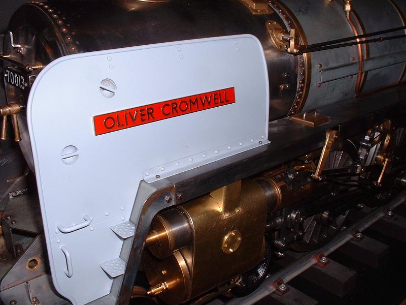 3/9/08 Mike M has kindly sent me the following background on the nameplate colours: "When the original batches of Britannias were introduced in 1951 and 1952, the newly-formed BR decreed that all nameplates for Brunswick Green locomotives would have a red background. This policy was officially changed around 1953-54, with a decision to have black backgrounds to all nameplates, and the last batch of Brits started with black plates as they were named. As locomotives became due for works visits, various workshops eventually went their own way with nameplate colours, with some reverting to red plates and one or two Britannias even running for a while with blue or emerald green coloured plates. The nameplates were gradually removed from around 1965 onwards to avoid theft by 'trophy hunters' but several locomotives later appeared with their names painted onto the smoke deflectors or with temporary 'hand made' wooden and even plastic plates. Indeed, pictures from 1968 show Oliver Cromwell running with red nameplates on August 4th 1968, yet it ran a week later with black coloured plates on the August 11th last steam special. I think the red plates were a set of very good facsimiles presented to the loco by one of the railway societies, the black set a week later being the loco's original plates, but I'm not entirely sure if this was the reason." So it may be that the original black plates have been in safe keeping all the time that the loco was at Bressingham, and have only now been restored. Anyway, I shall stick with the red plates, since they look prettier.