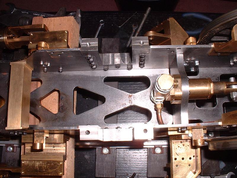13/7/09 I've completed the dismantling and etch-primed the frames. I'll next spray the outside of the frames black, and then paint the inside red in the area from the front of the horizontal stretcher as far back as the steam brake stretcher. I'll leave the axle pump and steam brake in brass. I'll use a brush for the red paint since masking the frames would be too complicated. I removed the axle pump stretcher to simplify painting - I was able to do this without disturbing the weighshaft brackets because I had the foresight to leave out the top two countersunk screws that are covered by the brackets. I've now also sawn about 5mm off the top of this stretcher to allow the top pipe to be fitted without disturbing it. If the pump has to be removed for maintenance at any point in the future, it should be possible to do so by unbolting the stretcher and sliding it down with the pump still attached, after removing some of the brake gear.