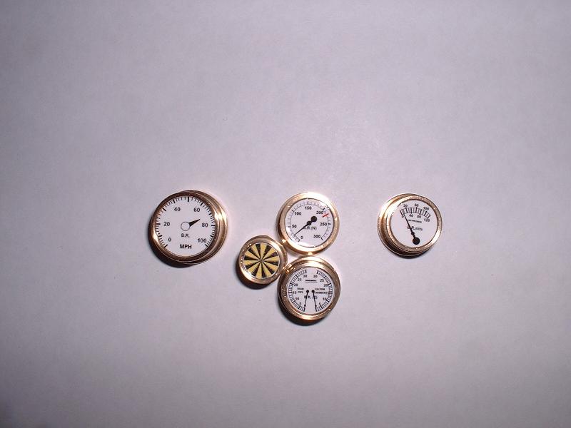 I've now made the dials for the gauges, as shown here. After trying without much success to reduce Harry's scans on the computer, I used Microsoft Paint to draw out the dials at a size of about 3" across on the computer screen and then used the scaling option on Paint's page setup to print them on glossy photo paper at the correct size, which is only 11mm diameter for the medium sized dials. I then brushed on clear nail varnish (actually 'Rimmel nail rescue' which I found on my wife's dressing table) to protect the printing. The definition of the inkjet printer is remarkably good - it's possible to read the word 'BUDENBERG' near the top of the dual vacuum gauge with a magnifying glass. If anyone would like to use the artwork to print their own dials, let me know. The speedometer is set at 70mph, which is rather optimistic with a cylinder chest steam pressure of only 20psi and no vacuum in the braking system!