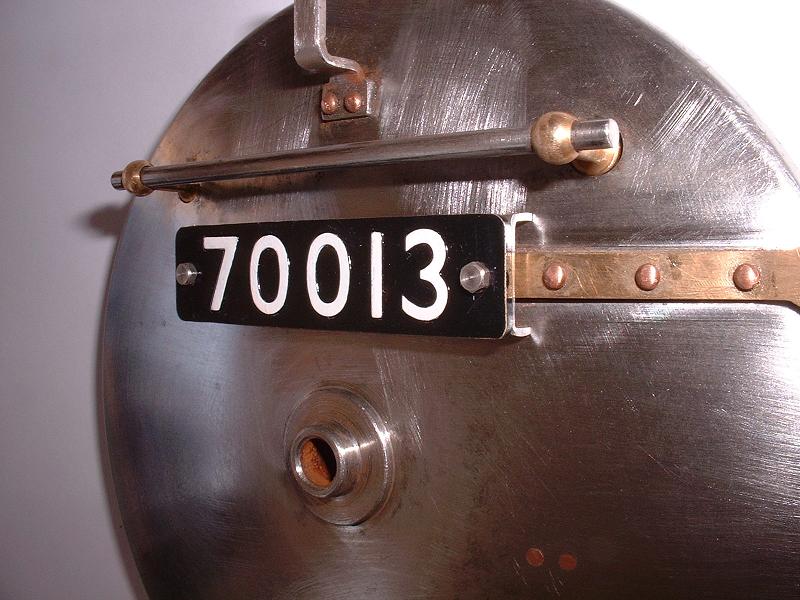 4/9/10 Rod tells me that he in fact only used transfers for the numbers and the BR crest, and used his Bob Moore lining pen with templates to paint the lining on the cab and tender sides. This probably gives a better result, since the Humbrol Orange gloss that I've used on the boiler bands and running boards is much brighter than the rather muted orange lines on the transfers. Brian B says that he too has had problems removing the transparent covering from the Phoenix transfers, and now leaves it in place. I've now applied the final touches to the locomotive - touching in bolt heads, varnishing the floor boards etc - and I just need to apply the transfers to the tender and reassemble it. I've also ordered a set of plates from Bill Hall - shed plate 32A (Norwich) for the smokebox, 'Built Crewe 1951' plates for the front frames, tender number 773 etc. 70013 had shed code 32A when it completed restoration at Loughborough as seen on my photo on the front page of this site, although I notice that it's since been replaced by 12A (Carlisle). 773 is the tender currently fitted to 70013, although it originally belonged to 70014 'Iron Duke'.