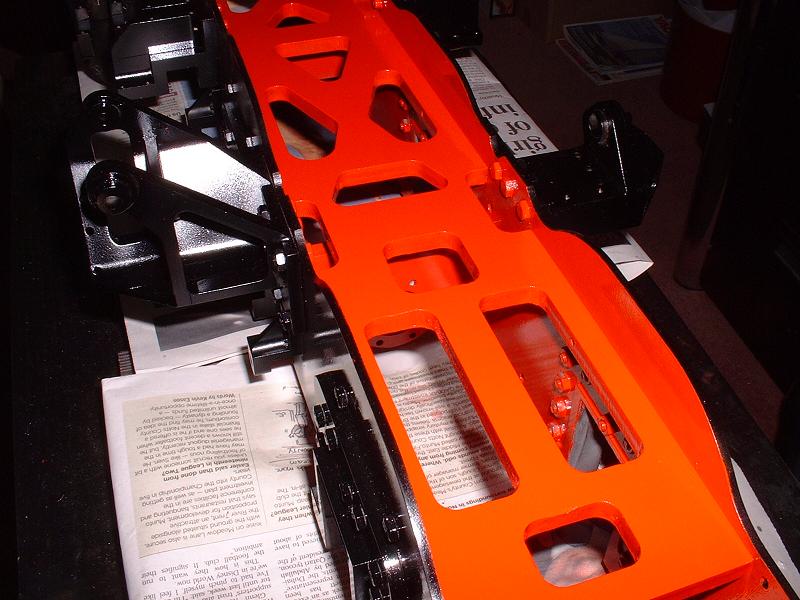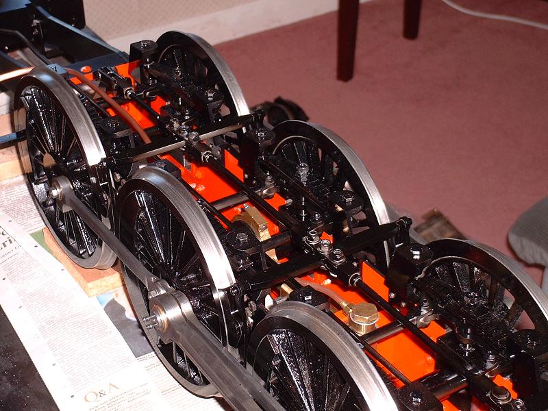 5/9/09 I've painted and reinstalled the front driving wheels along with the cylinder end caps and gland covers, slide bars, coupling rods and connecting rods. I've started painting the brake gear and drain cock linkage and when these parts are refitted I'll be ready to turn the chassis over and fit the valve gear and the lubricators. I'll take a picture of the underside before I do so. I've also cleaned up the bogie and pony truck, which I painted a long time ago prior to steaming. There are a few chips on the black paint on the pony frame, but the etch primer is still there - this is the Phoenix 2-part etch, which I used before I discovered the U-Pol spray cans. I've read elsewhere that the etch primer sticks to the metal better than the paint sticks to the etch primer.