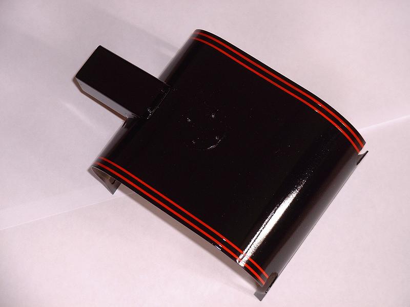 13/4/10 I've now etch primed the boiler cladding, which was the last major piece waiting to be primed. I've also sprayed the boiler bands black and I'm experimenting with the orange lining on the hidden underside of one of the bands. I'm using one of the strips from the double pinstriping tape that I bought for the cylinder lining, which happens to be 5/32" wide, to mask the centre of the 1/4" band. The resulting 3/64" lines are far wider than scale - the lines on the full size prototype are only 1/8" wide - but I think they look reasonably realistic. I bought a tinlet of Humbrol number 18 Orange Gloss and applied it by brush, but it's a bit thin to give a solid covering in one coat. I've now ordered a tinlet of Humbrol 82 Orange Lining Matt to see if that is any thicker. I read somewhere that it's best to let the Humbrol paint settle in the tin and then remove the thin layer at the top to get a thicker paint for lining. I could alternatively airbrush it, as Mark did on his model pictured above, or splash out on the Phoenix lining paint which is probably thicker.