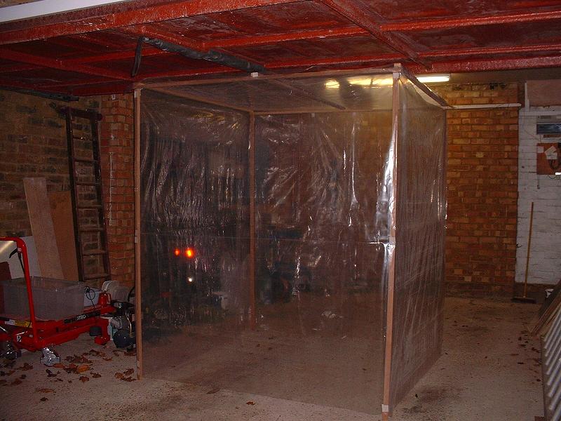 I started making the new spraying booth today - progress has been slow because I'm also busy decorating our new extension. I made a 6' square frame for the top, with a central batten suspended by hooks from the garage door opener track, and four 6'6" vertical wooden battens for the corners, each with a sawn-off screw in the top registering in a hole in the corner of the top frame. Tomorrow I plan to staple PVC sheeting over the top and a separate piece around the four walls, so that the walls can be rolled away and the top can be stored flat against the garage wall when not in use. The cheap PVC dust sheets that I've bought from the DIY shop (about £5 for 3 12'x9' sheets) look rather flimsy, but we'll see how they last.