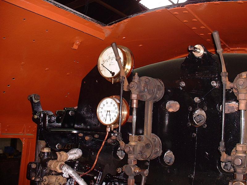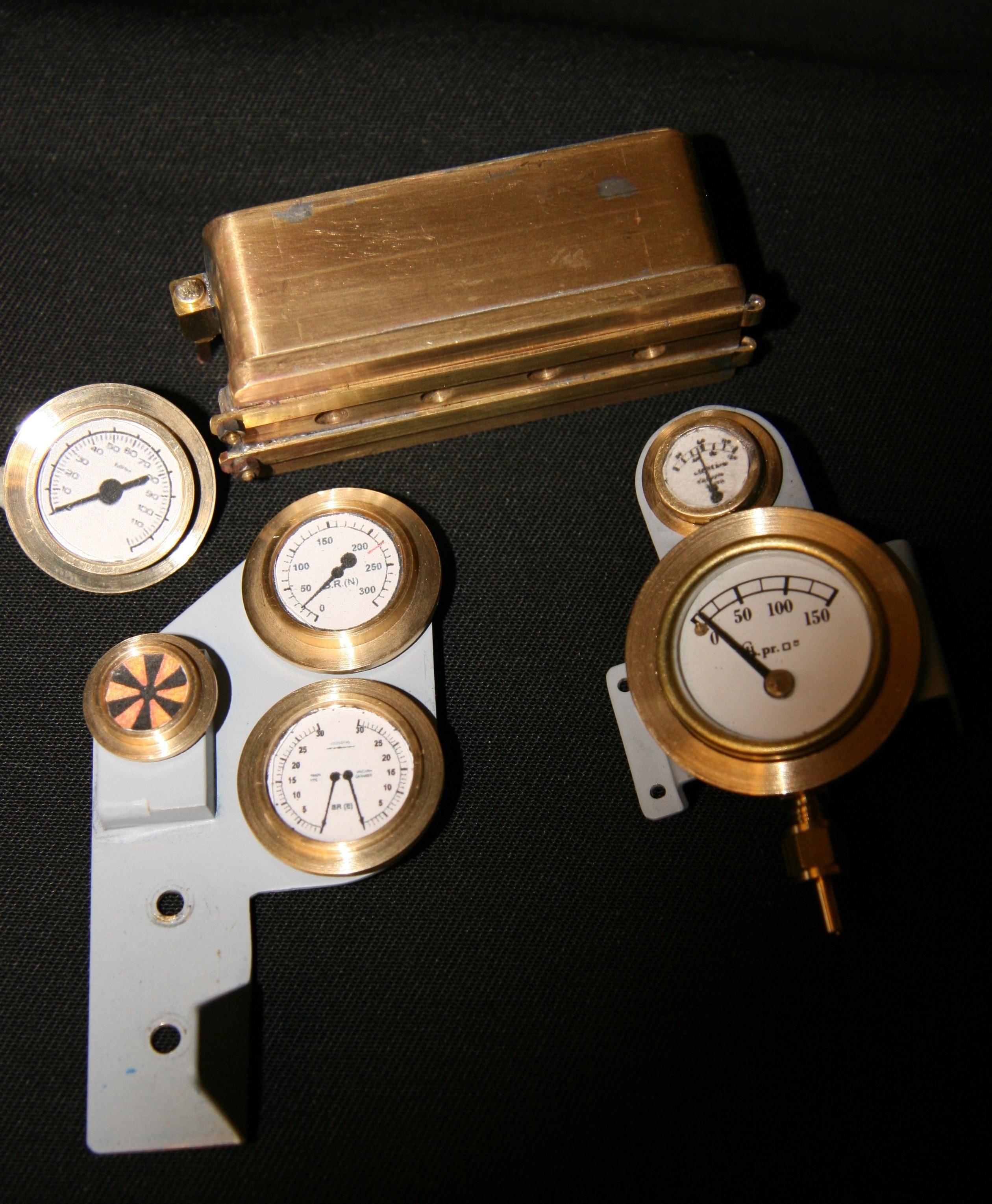 23/1/10 I've started to clean up the backhead fittings and fire doors in preparation for painting, and I'm making a set of dials for the gauges. Harry L has kindly sent me scans of the dial drawings that he made - he drew them out in a larger size and then reduced them on a photocopier, and the impressive results are shown here, along with his battery box. He's also turned new bodies for his gauges on the lathe. He sent me photos of the gauges currently fitted to 70013 which he took at Pickering in October 2009. This photo shows the speedometer, the black and yellow AWS indicator dial, the dual vacuum gauge and the cylinder steam pressure gauge above it, and this one also shows the boiler pressure gauge with the steam heating pressure gauge above it. Interestingly the cylinder pressure gauge has been changed since this photo that I took during the restoration.
