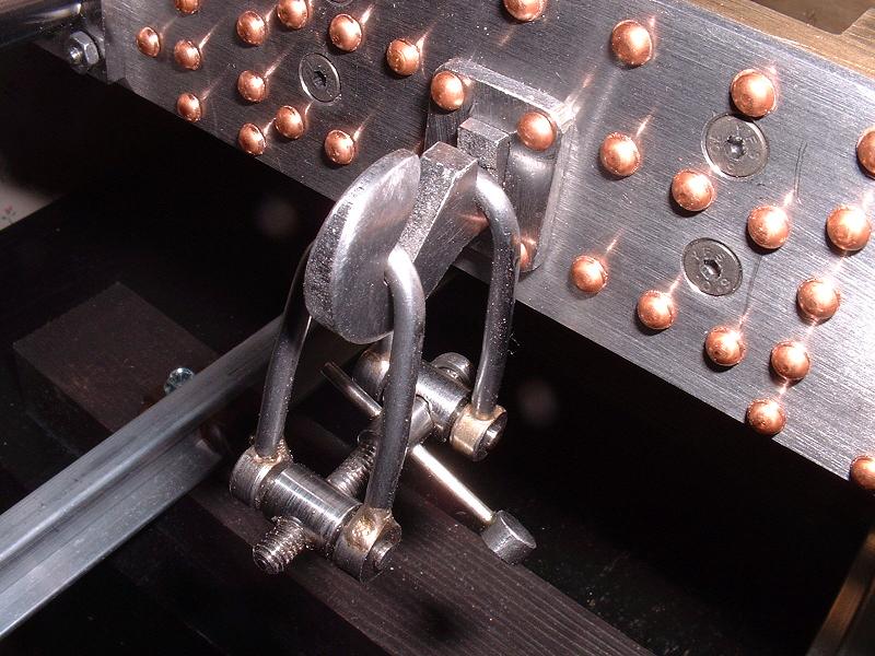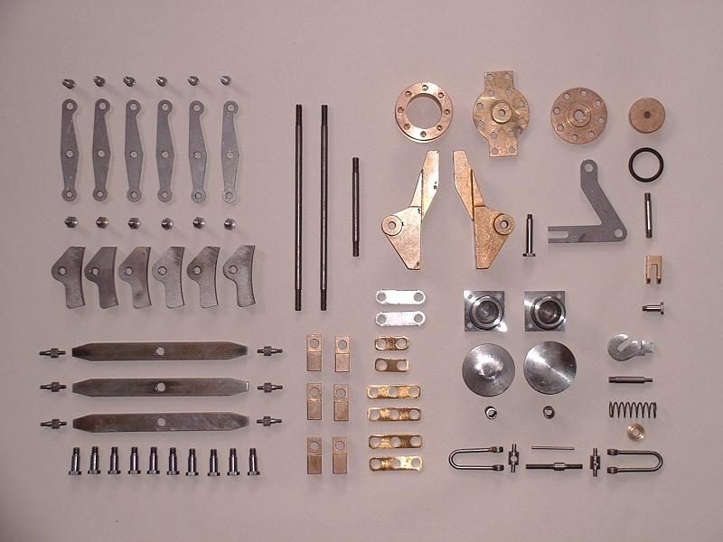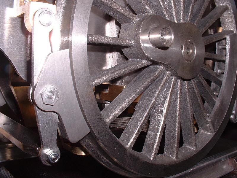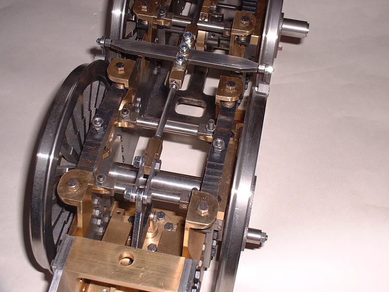 24/3/06 I fitted the rest of the brake hangers and shoes, and started to assemble the brake stretchers that connect the lower ends of the brake hangers on opposite sides, and the pullrods that connect the stretchers along their centre line. As with the pullrods on the tender, the linkage is rather floppy and can be improved by clamping the pullrod end fittings tightly between the connecting plates, still leaving the stretchers free to pivot and so equalise the pressure on each side. This can be achieved either by placing an M6 washer under the head of each link pin, or by cutting back the shoulders on the link pins so that the nuts can be tightened further. Tomorrow I'm planning to visit the Great Central Railway at Loughborough - they have an open day, and I should be able to see Oliver Cromwell in the workshops.