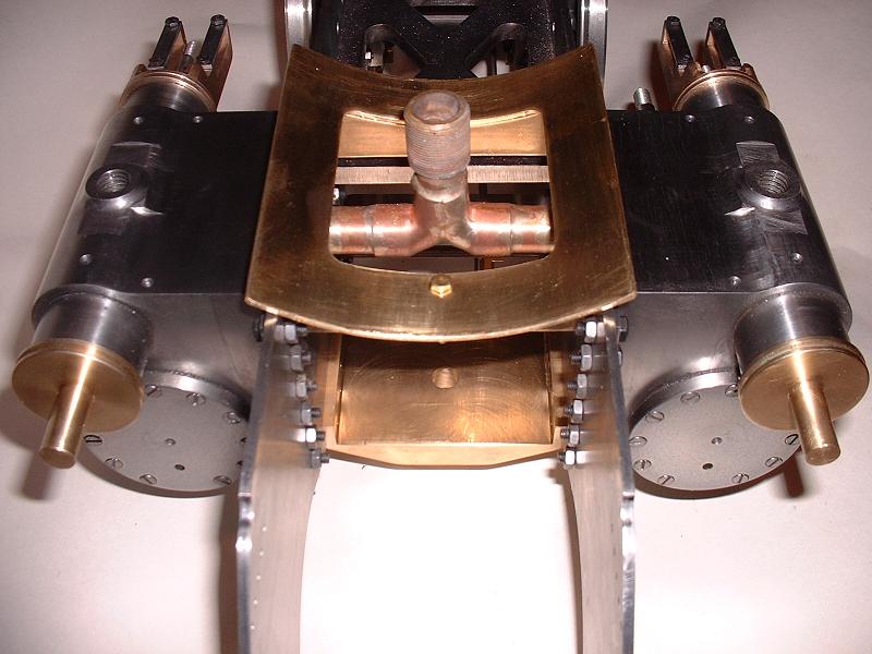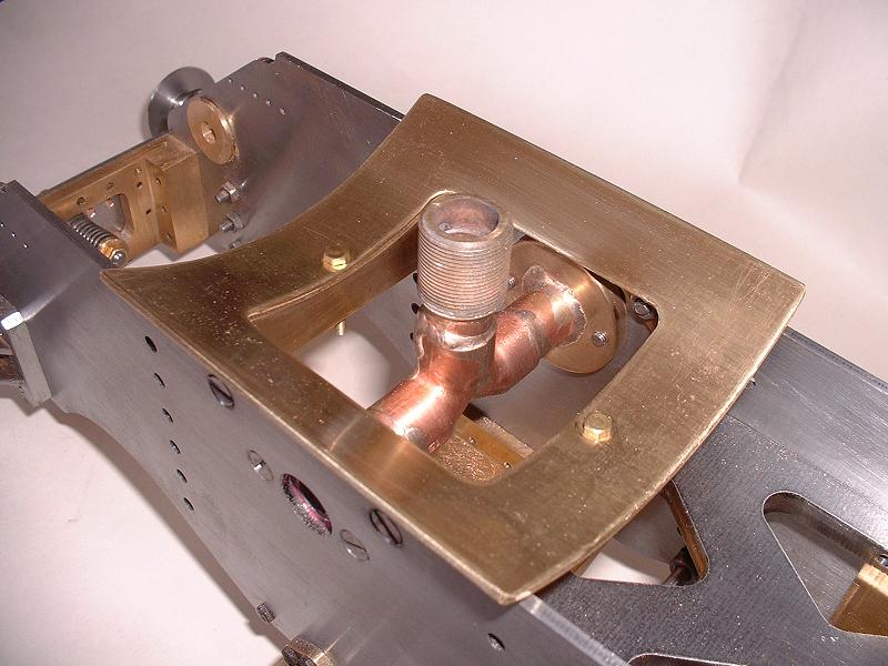 6/4/06 I started to fit the blastpipe, which is fabricated from copper pipes with brass flanges on the ends. It fits between the frames and takes the exhaust from the cylinders and directs it up into the smokebox. However, I soon found that the faces of the flanges were not parallel - there's a difference of 0.95mm between the widest and narrowest points - and so I couldn't get a good steam-tight fit to the frames. I've alerted Debbie and will need to send it back for replacement. I can't fit the smokebox saddle until the blastpipe is fitted, so I shall start on the cylinders.