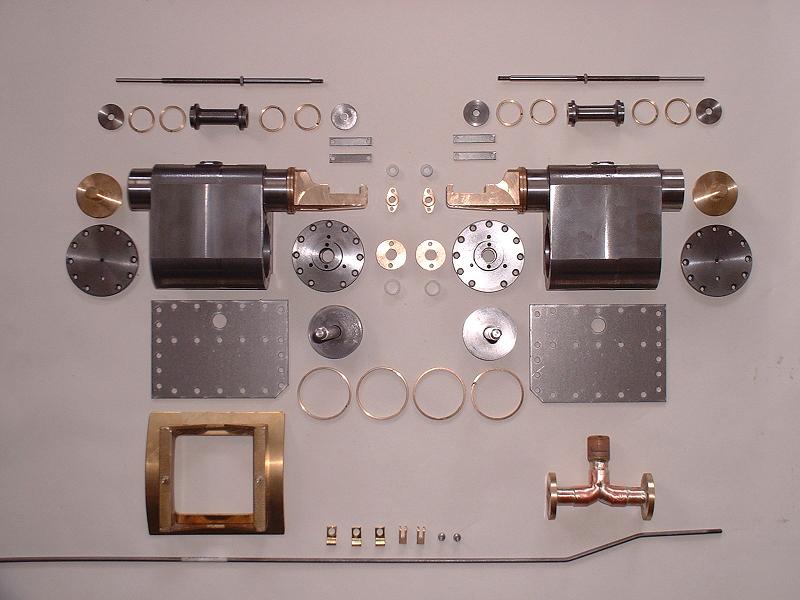 4/4/06 Kit 11 arrived at 8.00 this morning. It consists of the cylinders, pistons and valve pistons, the blastpipe and smokebox saddle, and the cylinder cock operating rod. The cylinders are beautifully machined from cast iron and the valve liners and guides are pre-fitted, presumably to ensure accurate alignment. The pistons are pre-fitted to the piston rods - they appear to be threaded on and then fixed with two punch marks. The rings for the pistons and valve pistons appear to be made from brass, and the gland packings for the rear cylinder and valve covers are PTFE cylinders.