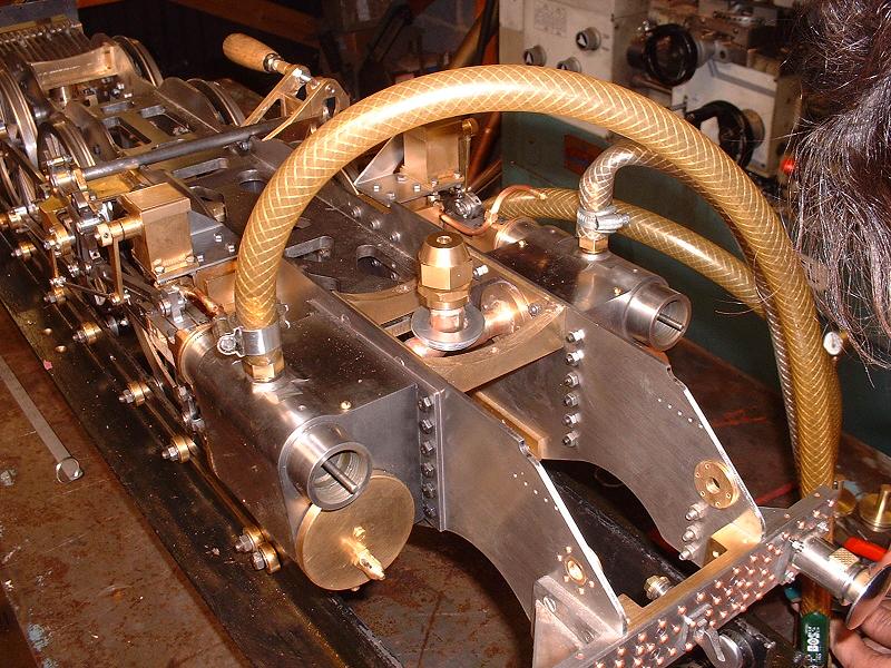 Ian agreed that it should be sorted out properly, and he proceeded to make a shorter radius rod by cutting a spare one and welding the two halves together, making it about 1.5mm shorter. This helped the balance between forward and reverse, but meant that the eccentric rod needed lengthening to compensate. Ian also agreed that the throw of the return crank should be reduced further to allow the full length of the expansion link to be used, as I mentioned on 17/7/06 above. Ian and Debbie promised to talk to the designer and test out these further improvements on the control model, and produce new parts in due course. I felt very happy with this outcome - I now know that the model already works well, and should be spot on with these further modifications. I also pointed out the leak to exhaust that I mentioned on 27/7/06 above - this affected both cylinders at the higher pressure of this test. Ian felt that it was probably leakage past the valve piston rings that would improve with running in, but I'll clearly need to watch this when I test on steam. It could also be leakage between the front and rear halves of the valve liners and the cylinder block - the liners are pressed in from each end.