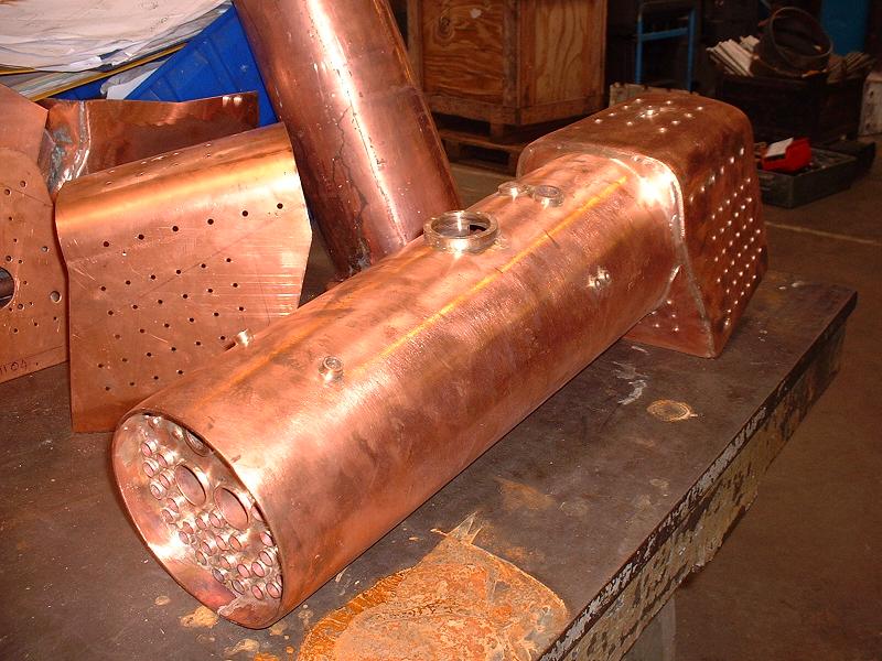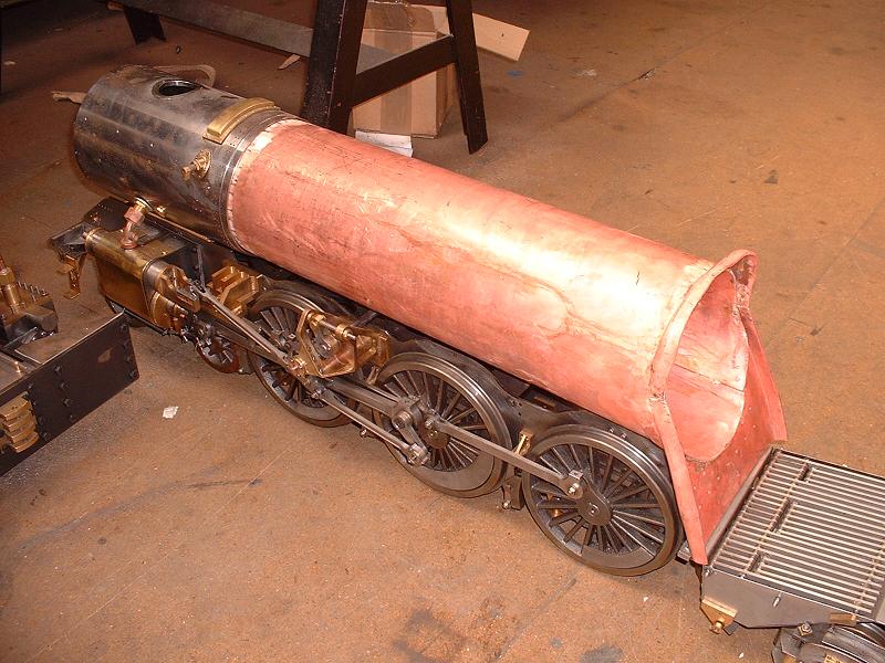 We also saw the prototype boiler in the factory, and I was very impressed with the quality of the workmanship as shown in this photograph. The boiler has a tapered barrel and the prototype has a reinforcing strip brazed over the outside of the joint along the bottom of the boiler. The new boiler regulations require this to be on the outside rather than the inside, presumably so that the inspector can see that it's there. This strip fouls the weighshaft and the rear stretcher on the prototype, so the joint is being placed to one side on the production boilers to avoid this problem. The second photograph shows the barrel of one of these boilers on the control model, and it appears to fit very nicely - the joint can just be seen on the lower right-hand side.