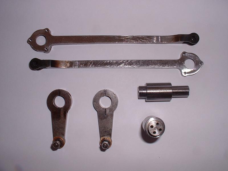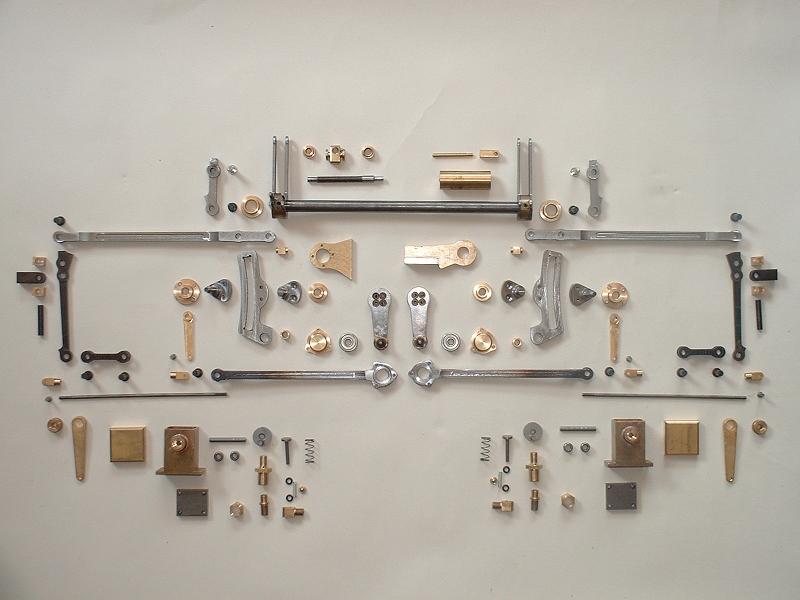 10/5/06 Kit 13 arrived at 7.30 this morning. It consists of the valve motion - return cranks, eccentric rods, expansion links, radius rods, lifting links, combination levers and links, valve crossheads, weighshaft and reversing screw - along with the lubricator assemblies. All the parts seem present and correct, although I know that the return cranks and eccentric rods are due to be replaced because of the problem I described in kit 12 on 7/5/06. Some of the rods are blackened, presumably because they have been case-hardened - hopefully this will polish off. The numbering of some of the bags of lubricator parts differs from that in the parts list, but I think that they are all there. The ISO drawing of the lubricator is missing, so I'll ask Debbie for this. The instructions say that the lubricators cannot be fitted until the next kit - it looks as though different spacer plates are needed here. We're going to be away sailing for the next few days, so there'll probably be no more updates until Sunday.