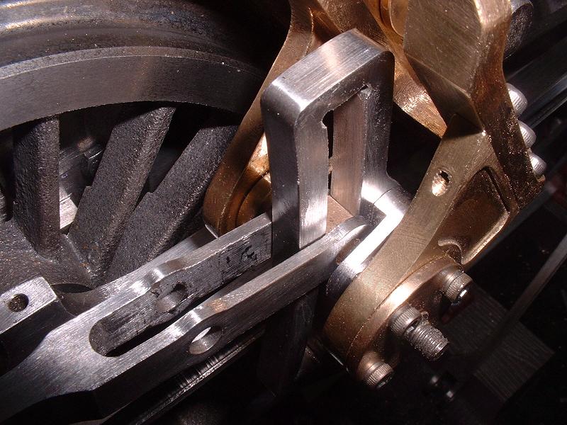15/7/06 I've now received my replacement driving wheels, return cranks and eccentric rods. The eccentric rods are about 3mm shorter than the originals, and the return cranks have the four screw holes drilled at an angle to the line of the crank to reduce the throw, and the screw holes are slightly smaller to give a more precise registration. A very quick trial assembly of the left-hand motion suggests that the problem has been solved - the motion makes a full revolution in full forward gear without anything fouling, and the valve crosshead moves over exactly the full length of its guides.