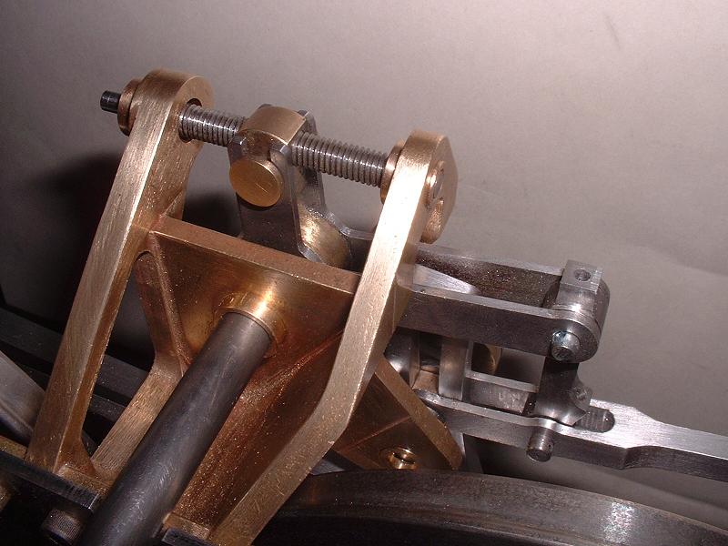 5/4/08 I've now finally set up the valve gear to my satisfaction. I moved both weighshaft brackets back by about 2.5mm to centralise the valve crosshead motion when in neutral gear. I then used the shorter eccentric rods and made new off-centre bearings in the expansion links to increase the effective length of the eccentric rods by nearly 1mm, and this gives balanced movement in both forward and reverse (I made the off-centre bearings from the spare spacers for the middle regulator bracket in kit 18b, filing out the 3mm holes to be eccentric and then running a 5mm drill through). I used the second set of fixed return cranks, which give a throw of 31mm and the correct valve timing, and I filed a bit more off the top corners of the expansion links to avoid them touching the weighshaft bosses. I'd previously filed the upper bosses on the lifting links to stop the expansion links touching them in half-forward gear. I set the valve bobbins by subtracting the length of the bobbin from the overall length of the valve liners and halving this to give the depth of the front of the bobbin from the front of the liner when centralised in the liners - I calculated this depth as 36.8mm. I then measured the depth of the bobbin at the front and back of its travel in full forward gear, using the depth gauge on my digital calipers, and took the mean of these to give the position of the front of the bobbin at its mid travel. I then screwed the valve spindle in or out of its clevis to achieve the required 36.8mm. I'll now drill some extra holes through the weighshaft brackets and frames to register them permanently. I'll also fit locknuts to the reversing screw to limit the lifting arm travel to that needed for full valve travel, which occurs at about 75% of the way down the expansion link slot.