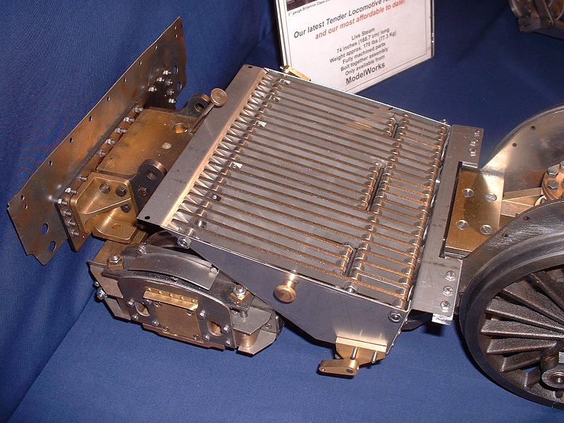 I did a trial assembly of the ashpan and grate, and fitted it to the frames - it went together quite easily. The photograph shows the underside with the three rotating shutters for emptying the ashpan. The front of the ashpan is secured to two brackets bolted through the top rear bolt holes of the rear stretcher - the M5x16 bolts provided only engage the brass stretcher by a couple of turns, and need to be replaced by M5x20. The rear end rests on two further brackets mounted just in front of the drag frame, but it is not bolted to these brackets - perhaps to allow for expansion when the grate gets red hot. The rod carrying the three shutters needs to be slid through the gap between the pony truck and the underside of the rear frames, and under the cylinder cock operating rod, before being fitted into the bearings on either side of the ashpan. I was a bit concerned that the modified spring carriers on my freshly painted pony truck might foul the underside of the ashpan, but there is a clearance of several millimetres. I see that Jason has placed an order for the forthcoming Modelworks Duchess, and has started a Duchess Builder website to record progress.