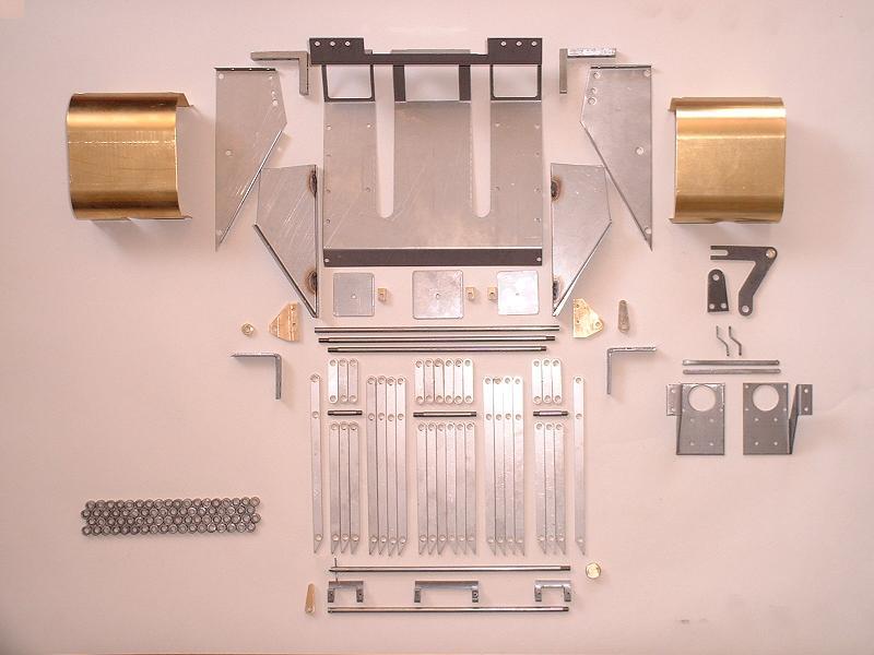 20/06/06 Kit 15 arrived at 8.40 this morning. It consists of the ashpan and grate, together with replacements for the incorrect axle pump link and steam brake crank that I mentioned in kits 9 and 10 respectively, and the replacement lubricator mounting brackets, brass covers for the cylinders, and drain cock links. The ISO drawings were not included with the instructions, so I've asked Debbie for these and she has put them in the post. Fortunately I have my picture of the control model at Harrogate which has enabled me to lay out the contents in hopefully the right sort of positions for this photograph. All the parts seem to be present and correct. The instructions seem to relate to the earlier Winson verson of the kit, which only had one central set of hinged grate bars instead of the three sets in the new version, and where the locking pin for the grate bars went through holes in the bars rather than underneath the bars. However, the photograph of the control model makes everything pretty clear.