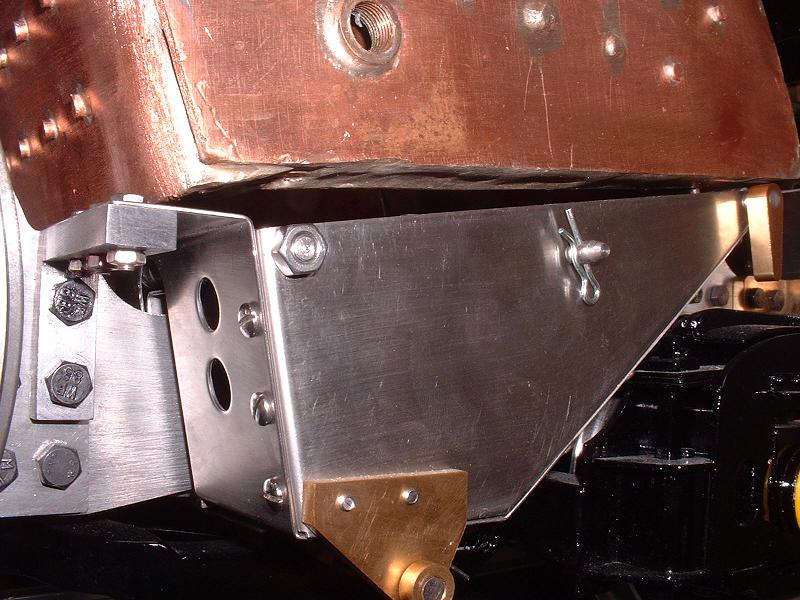 I polished and assembled the stainless steel ashpan. The thick brass brackets bolted to the lower front of the side plates to carry the shutter pivot rod are rather unsightly and seem to have been added as an afterthought, since they cover holes that look as though they were intended to carry the pivot rod above rather than below the shutters. The right-hand bracket will probably be covered by the dummy exhaust steam injector, but I might try to substitute something less obtrusive on the left-hand side, or perhaps just fix the bracket on the inner face and cut a gap in the shutter frame for it.