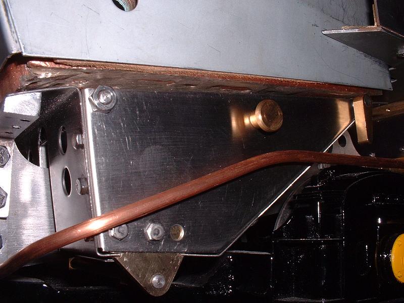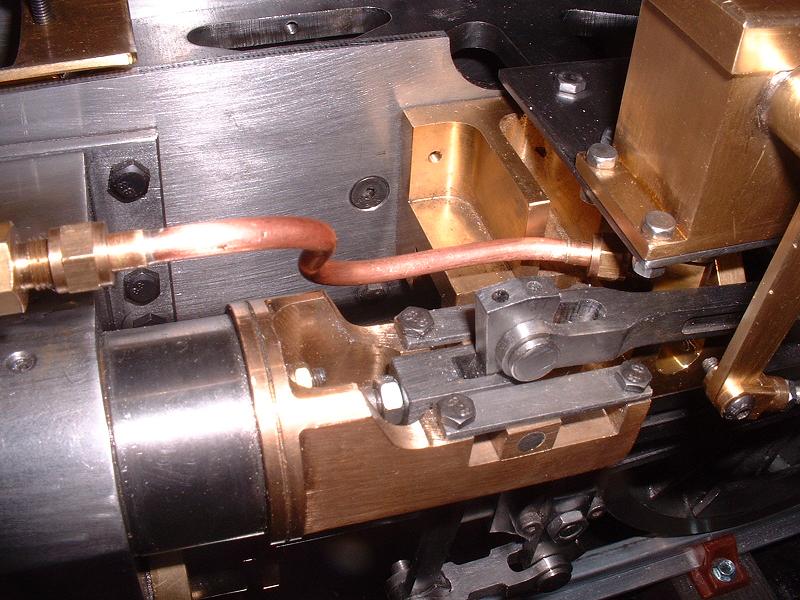 28/06/06 I made the above changes to the lubricator linkage and also tapped out the M3 holes in the clevises so that the threaded ends of the rod go in to their full depth. Ted tells me that he filed down the locknut for the expansion link crank and fitted it underneath the crank, and I will probably do the same. I tested the lubricator with light machine oil and found a slight leak from the outlet pipe adaptor, so I dismantled it and sealed it with PTFE tape. I started fitting the right-hand lubricator.