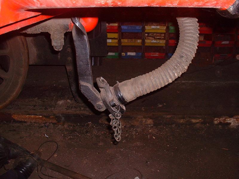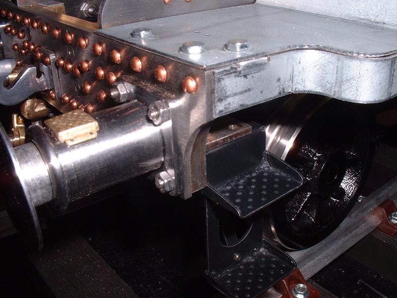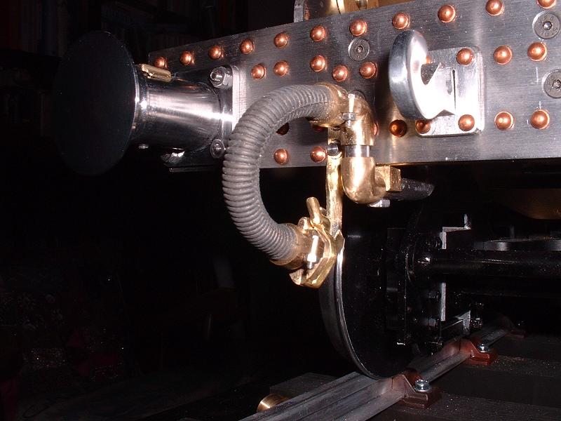 I've made the stay to support the end of the vacuum hose from a 5mm x 1.5mm strip of brass, bolted to the buffer beam with 2 small-headed 8BA bolts and twisted through 90 degrees. I removed one of the rivets to make space for this. I won't attempt to make the fitting at the lower end of the stay until I next visit Loughborough and have a chance to inspect the real thing. Doug Hewson is out of stock of the steam heating hoses at the moment.