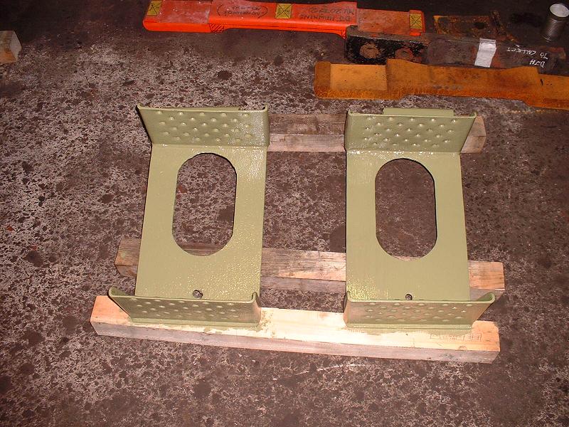 The front steps arrived from Doug Hewson this morning - they are a nice match for the tender steps that I bought from him some time ago, and an exact replica of 70013's front steps that I painted at Loughborough a couple of months ago. The hole in the buffer beam bracket for the inner end of the support stay needed to be repositioned, so I removed the entire buffer beam and brackets as a unit to do this - it is no longer possible just to turn the locomotive upside down! The steps then fit nicely, as shown in the photograph.