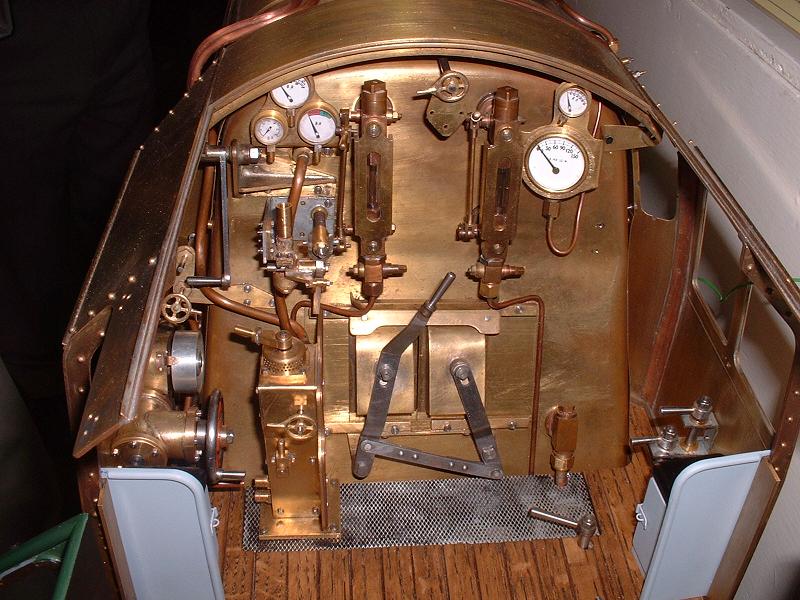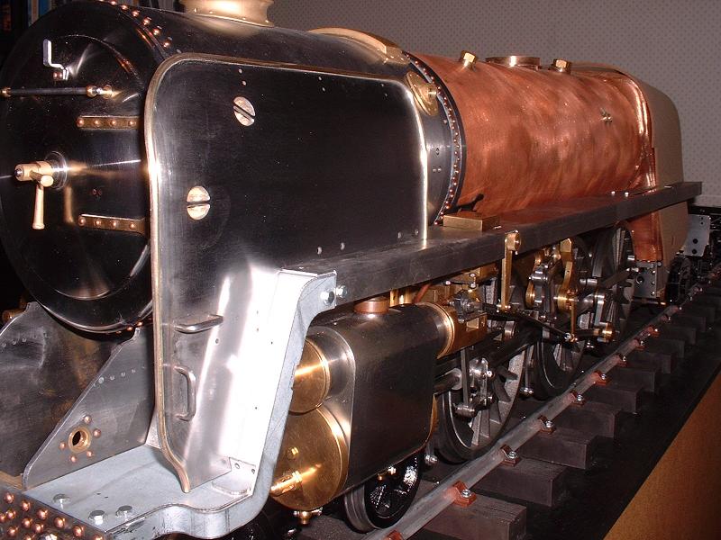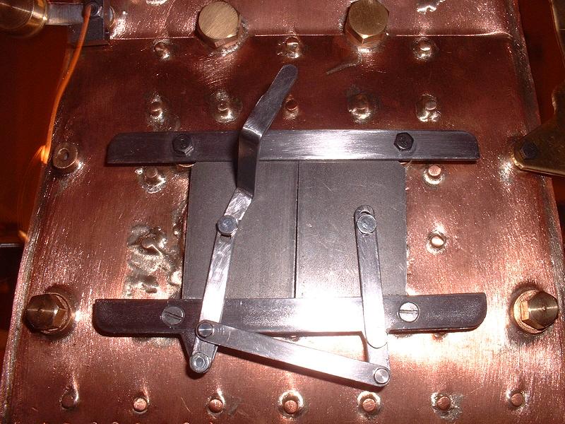 8/3/07 I've cut two plates with rounded top and bottom edges and silver-soldered them to the firebox doors, so they now look similar to Britannia's. Scratch-built models to the Spink plans seem to have a slightly different style with a hood, open at the bottom, on the front of the door - this picture of a superb model seen at Harrogate last year shows this style. I don't know which style 70013 has - the firebox doors are probably locked away in a container somewhere at Loughborough at the moment. I've also hidden the countersunk screws on the lower runner as described on 5/3 above. Another little problem I've noticed is that the right-hand lever doesn't swing nearly as far as the left-hand one - I think the hole for the right-hand end of the connecting link should be about 7mm below the pivot, rather than 10mm, so I'll adjust this.
