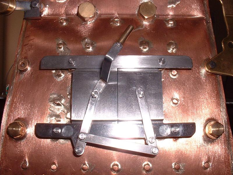 6/3/07 I've made a brass handle from 3/16" rod, drilled and tapped 8BA and fitted to a bolt silver-soldered to a notch in the shortened top of the operating lever. I've also bought some 1/8" steel plate to add another layer to the firebox doors. Picture to follow when all these improvements are complete.