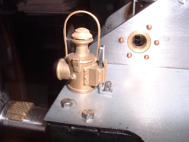 27/2/07 The brass lamp irons provided looked rather thin at 0.9mm compared with the 1.6mm of the tender and smokebox lamp irons, so I decided to make some new ones from 1.6mm steel strip. The photo shows the first one completed, along with one of the two superbly detailed lamps that I bought from the Miniature Railway Supply Co a year ago. Incidentally it's been pointed out that the rivets in the lifting rings in the frames should be flush on both sides, so I'll correct this when I dismantle for painting and can get a file to them. Update 3/4/07: I've now done this, while the buffer beam is removed for painting.