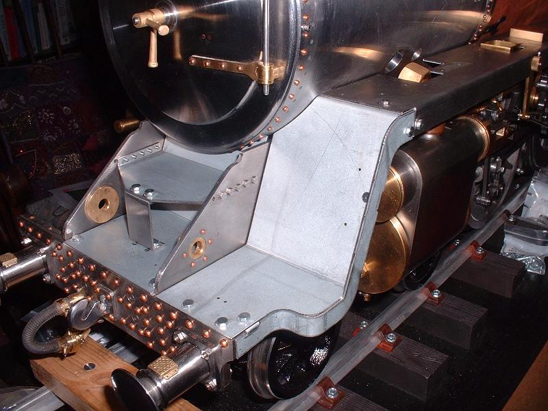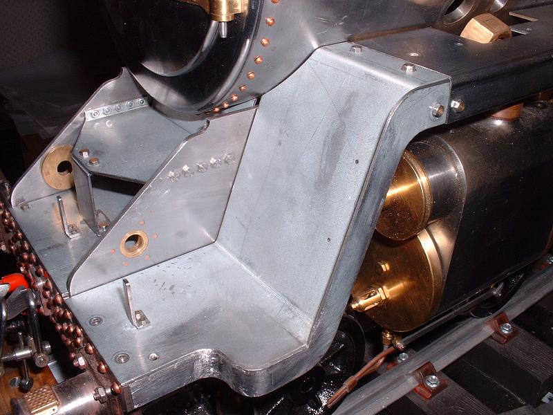 26/12/07 I've started fitting the right-hand running board, which needed trimming in much the same way as the left-hand one. One small error that Ted pointed out is that this running board has a semicircular cut-out in line with the boiler top feed so that the feed pipe from the injector can run under the board and emerge at the front to run up to the top feed, but on the prototype the feed pipes on both sides are fitted above the running boards. I'll solder in a piece of steel to fill this cut-out, and cut an opening just in front of the firebox to match the one on the left-hand side.
