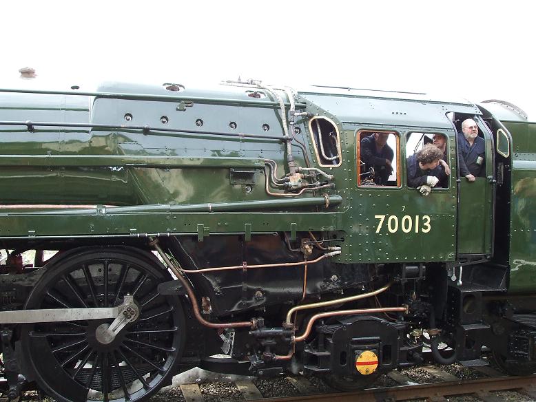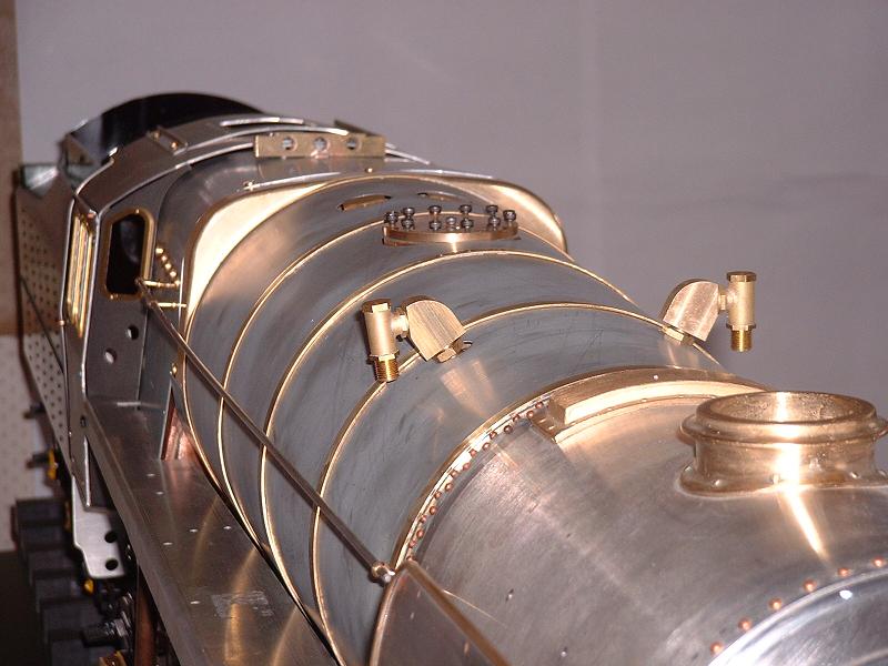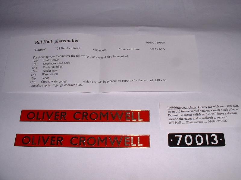 Modelworks do now have the name and number plates in stock, and I asked them to send me mine. They look very nice indeed - the photo doesn't do them justice (probably a jpeg artefact as a result of reducing the picture size). Modelworks have not supplied the other plates, which is disappointing since they were shown in the brochure photograph, but they can be ordered directly from the maker for £48 - the photo shows his details. I'll wait to check the tender number etc on 70013 at Loughborough before ordering them. I've also received this photo from Rod A showing the superb improvements that he's made to his firebox - six correctly placed flush-mounted washout plugs on the left-hand side, further washout plugs lower down and on the rear of the boiler cladding, mudhole doors and steps (all from Doug Hewson), boiler bands around the firebox, copper backhead cladding, and simulated joints between the firebox cladding plates. Note also the sandbox lids and the speedometer fitting on the rear crank, which he made from scratch. He tells me that he's also made a lot of improvements to the cab. I shall have to revisit my firebox!