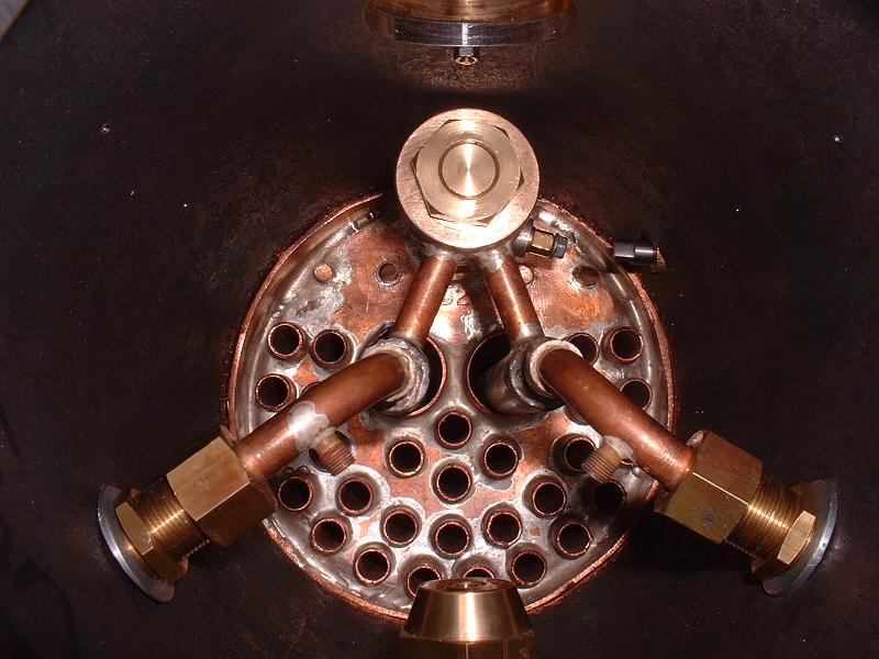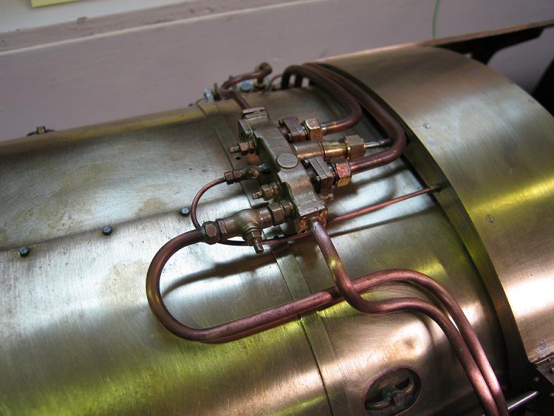 30/1/08 The photo shows the blower pipes and duplex valve - I just need to add dummy control rods running from the back of the duplex valve to the cab. I've positioned the blower valve above the reverser gearbox, where it will be easy to reach. I've used one of the 90 degree globe valves which were probably intended for the water feeds to the injectors (although the ISO diagrams show straight-through ones - see the problem list below). I plan to buy different water valves with a 90 degree on-off movement, so this valve is effectively spare. The next job is to run the pipe from this blower valve to the smokebox - I'll need to make a longer one, since I've positioned the valve on the opposite side of the cab.