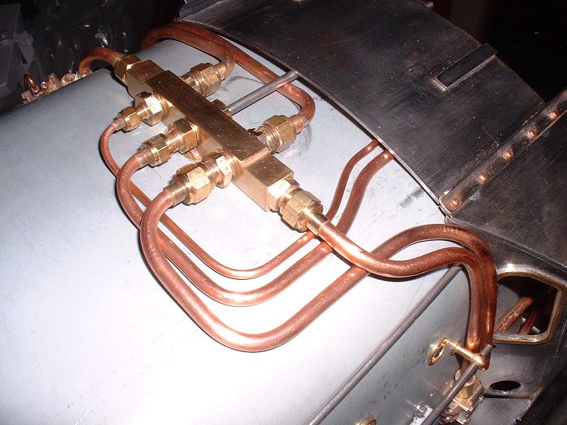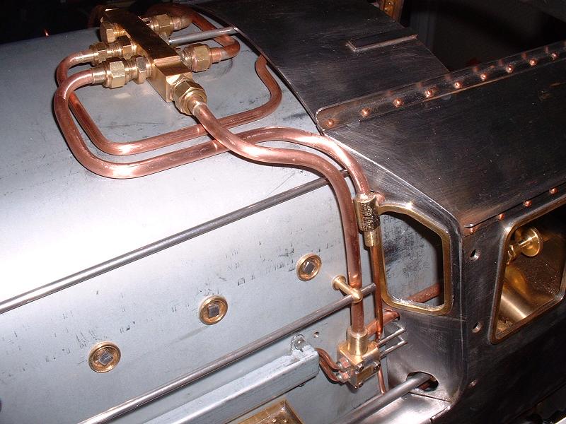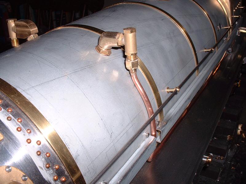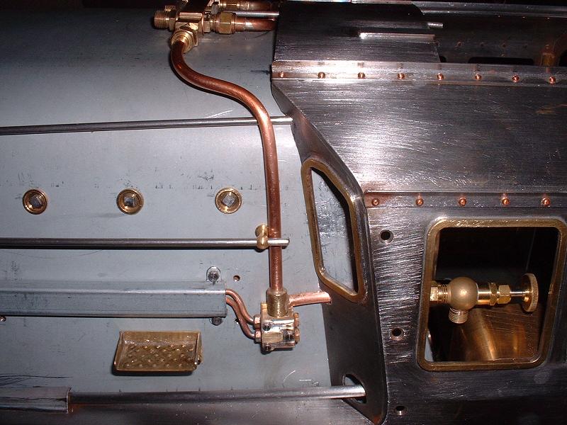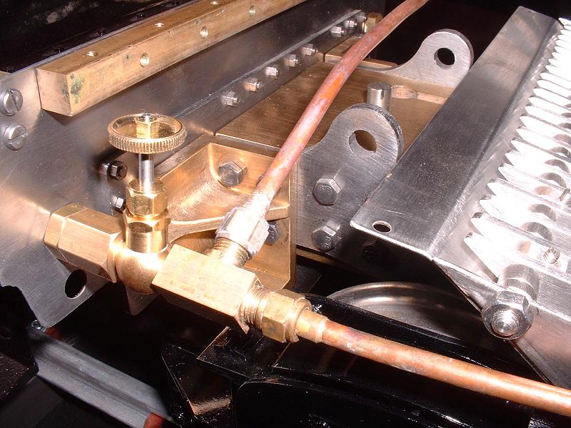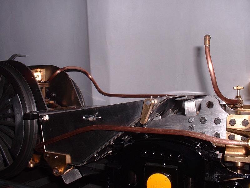 2/2/08 I've made a new pipe to run from my repositioned blower valve to the fitting on the right-hand side of the smokebox. I routed it down from the valve, forward through a slot in the spectacle plate under the left hand running board, across under the boiler in front of the firebox, and along under the right hand running board to the smokebox fitting. It's just possible to wiggle it in and out without removing the boiler. I've now used up most of the 5ft length of 3/16" pipe that I bought, but I should be able to cannibalise the old blower pipe for any further new sections. The pipe from the smokebox fitting to the chimney has not been supplied, but I imagine that this is just a simple piece of pipe with the open end positioned alongside the blastpipe nozzle and pointing upwards into the petticoat pipe.