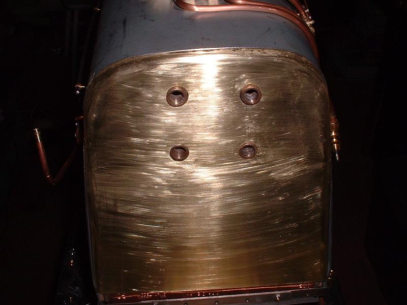 15/2/08 I made a former for the top half of the cladding from a piece of softwood and hammered the edges over it, stopping frequently to re-anneal the brass. I then filed the curves to remove most of the irregularities. I've replaced yesterday's photograph to show the result. There are a few remaining blemishes, but I don't think it's too bad considering that it's my first attempt at panel-beating. The next step is to bolt it to the firebox cladding, then make the remaining holes, fit the firebox doors and make new more realistic brackets for the regulator and the injector and whistle valves.