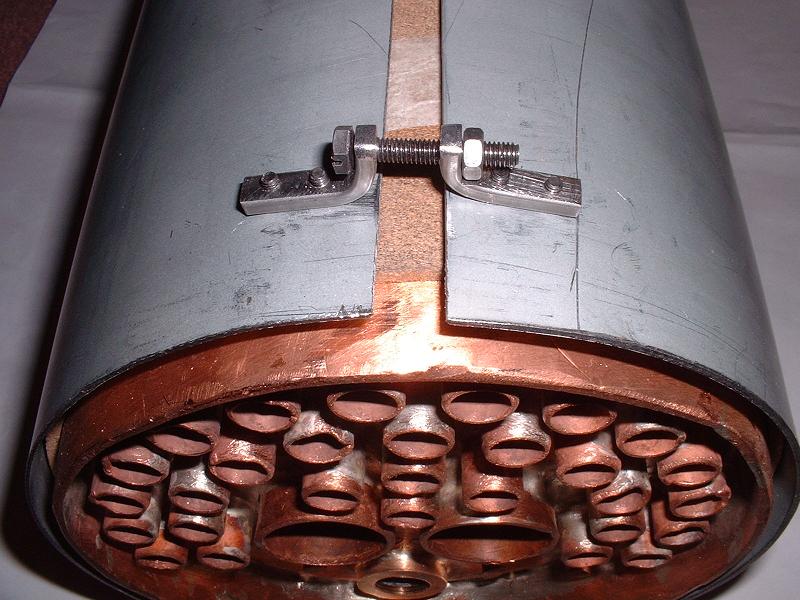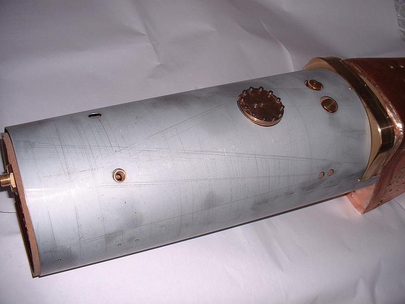 I'm starting a trial assembly of the boiler and firebox lagging and cladding. The main cladding sections are made of zinc-plated steel rather than the brass shown in the brochure, but the upper throatplate cladding is a beautiful piece of solid brass weighing nearly 3lb. The saving from not using sheet brass cladding has probably been outweighed (literally) by the cost of this piece, which I've seen made from car body filler on scratch-built models! The steel will hold the paint better than brass and be less prone to dents, but I'm concerned that it might rust on the cut edges, particularly around the safety valves with the inevitable dampness in the lagging there. Ted has already assembled his cladding, and he tells me that it fits well apart from the holes for the regulator bracket on the side of the boiler barrel which are a bit too high.