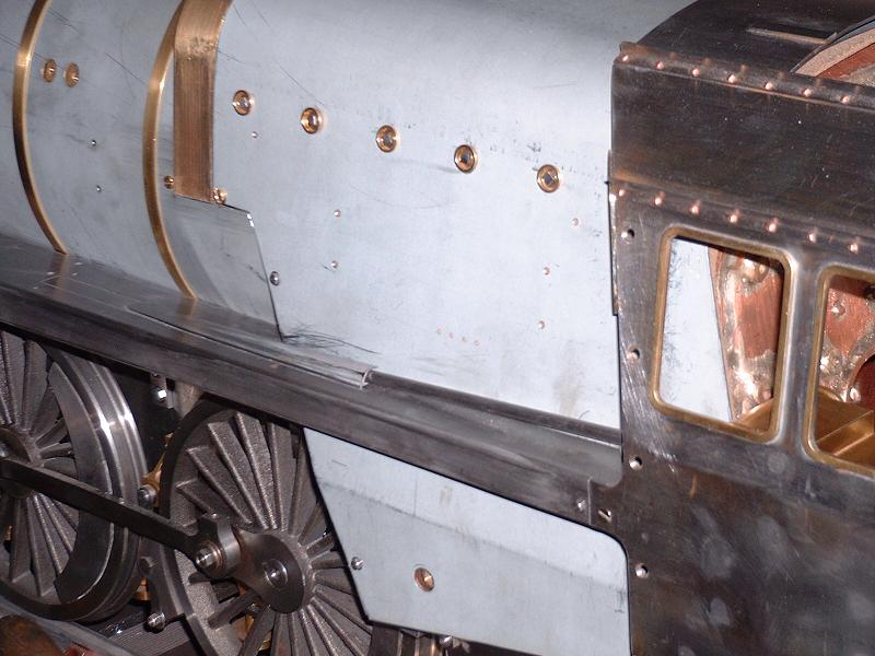 14/1/08 I've completed the boiler handrails - I lowered the front firebox stanchions by 1.5mm by slotting their holes to reduce the bend at this point, and the rails run straight from smokebox to firebox front, then curve gently downwards and inwards along the firebox sides. I also fitted the firebox steps that I made previously (see 7/12/07 above) with 10BA bolts. I then fitted the three pipe covers along the left hand side of the boiler and firebox - these cover the blower and vacuum brake ejector pipes on the prototype, and I'll fit dummy pipes in the visible sections later. I shortened the rear of the middle cover by about 13mm and moved the rear cover forward to meet it - this gives a better fit around the front of the firebox, and I think positions the rear end more accurately. I trimmed all the bolt flanges down and used small-headed M3 bolts to fix the covers. This more or less completes the platework, apart from filling superfluous holes and adding the cab rivets, and I'll start on the pipework next.